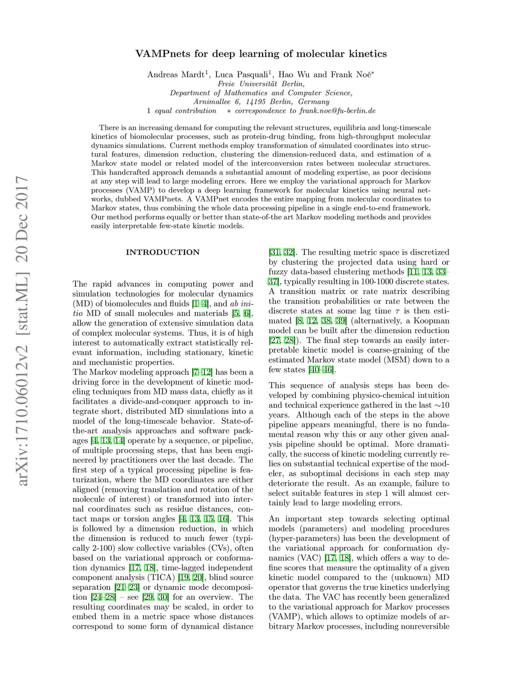 VAMPnets: Deep learning of molecular kinetics