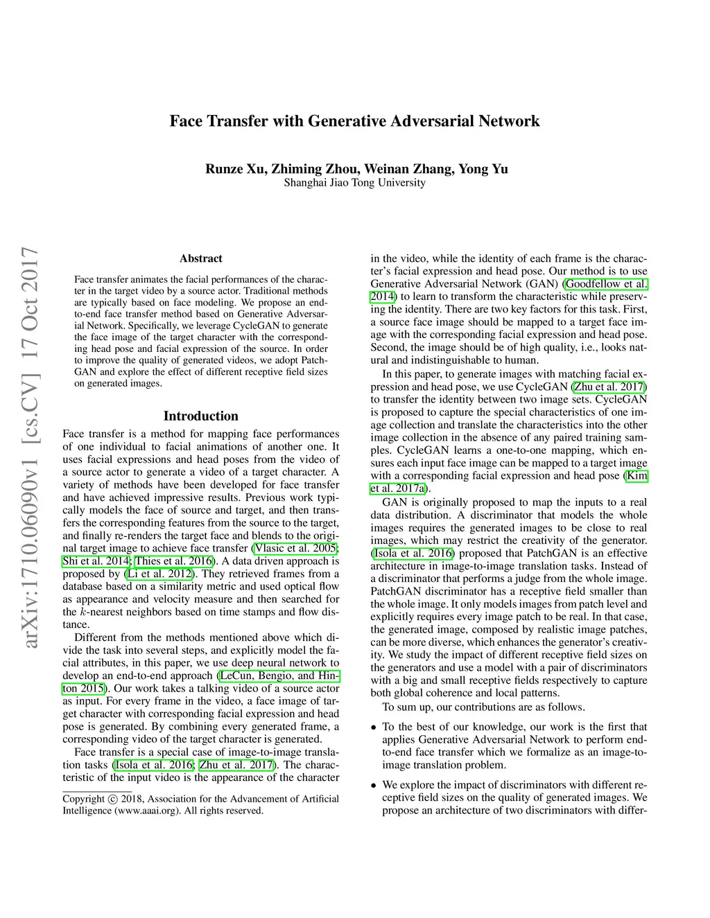 Face transfer animates the facial performances of the character in the target video by a source actor. Traditional methods are typically based on face modeling. We propose an end-to-end face transfer method based on Generative Adversarial Network. Specifically, we leverage CycleGAN to generate the face image of the target character with the corresponding head pose and facial expression of the source. In order to improve the quality of generated videos, we adopt PatchGAN and explore the effect of different receptive field sizes on generated images.