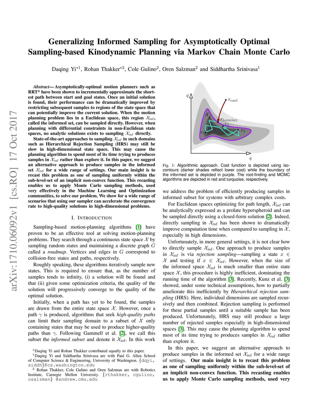 Asymptotically-optimal motion planners such as RRT* have been shown to incrementally approximate the shortest path between start and goal states. Once an initial solution is found, their performance can be dramatically improved by restricting subsequent samples to regions of the state space that can potentially improve the current solution. When the motion planning problem lies in a Euclidean space, this region , called the informed set, can be sampled directly. However, when planning with differential constraints in non-Euclidean state spaces, no analytic solutions exists to sampling directly. State-of-the-art approaches to sampling in such domains such as Hierarchical Rejection Sampling (HRS) may still be slow in high-dimensional state space. This may cause the planning algorithm to spend most of its time trying to produces samples in rather than explore it. In this paper, we suggest an alternative approach to produce samples in the informed set for a wide range of settings. Our main insight is to recast this problem as one of sampling uniformly within the sub-level-set of an implicit non-convex function. This recasting enables us to apply Monte Carlo sampling methods, used very effectively in the Machine Learning and Optimization communities, to solve our problem. We show for a wide range of scenarios that using our sampler can accelerate the convergence rate to high-quality solutions in high-dimensional problems.
