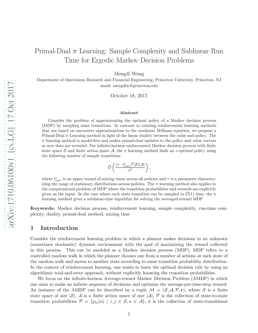 Consider the problem of approximating the optimal policy of a Markov decision process (MDP) by sampling state transitions. In contrast to existing reinforcement learning methods that are based on successive approximations to the nonlinear Bellman equation, we propose a Primal-Dual Learning method in light of the linear duality between the value and policy. The learning method is model-free and makes primal-dual updates to the policy and value vectors as new data are revealed. For infinite-horizon undiscounted Markov decision process with finite state space and finite action space , the learning method finds an -optimal policy using the following number of sample transitions where is an upper bound of mixing times across all policies and is a parameter characterizing the range of stationary distributions across policies. The learning method also applies to the computational problem of MDP where the transition probabilities and rewards are explicitly given as the input. In the case where each state transition can be sampled in time, the learning method gives a sublinear-time algorithm for solving the averaged-reward MDP.