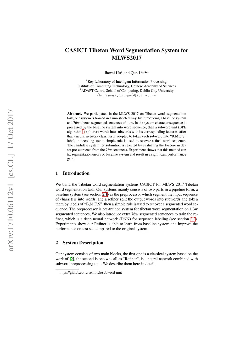 We participated in the MLWS 2017 on Tibetan word segmentation task, our system is trained in a unrestricted way, by introducing a baseline system and 76w tibetan segmented sentences of ours. In the system character sequence is processed by the baseline system into word sequence, then a subword unit (BPE algorithm) split rare words into subwords with its corresponding features, after that a neural network classifier is adopted to token each subword into "B,M,E,S" label, in decoding step a simple rule is used to recover a final word sequence. The candidate system for submition is selected by evaluating the F-score in dev set pre-extracted from the 76w sentences. Experiment shows that this method can fix segmentation errors of baseline system and result in a significant performance gain.