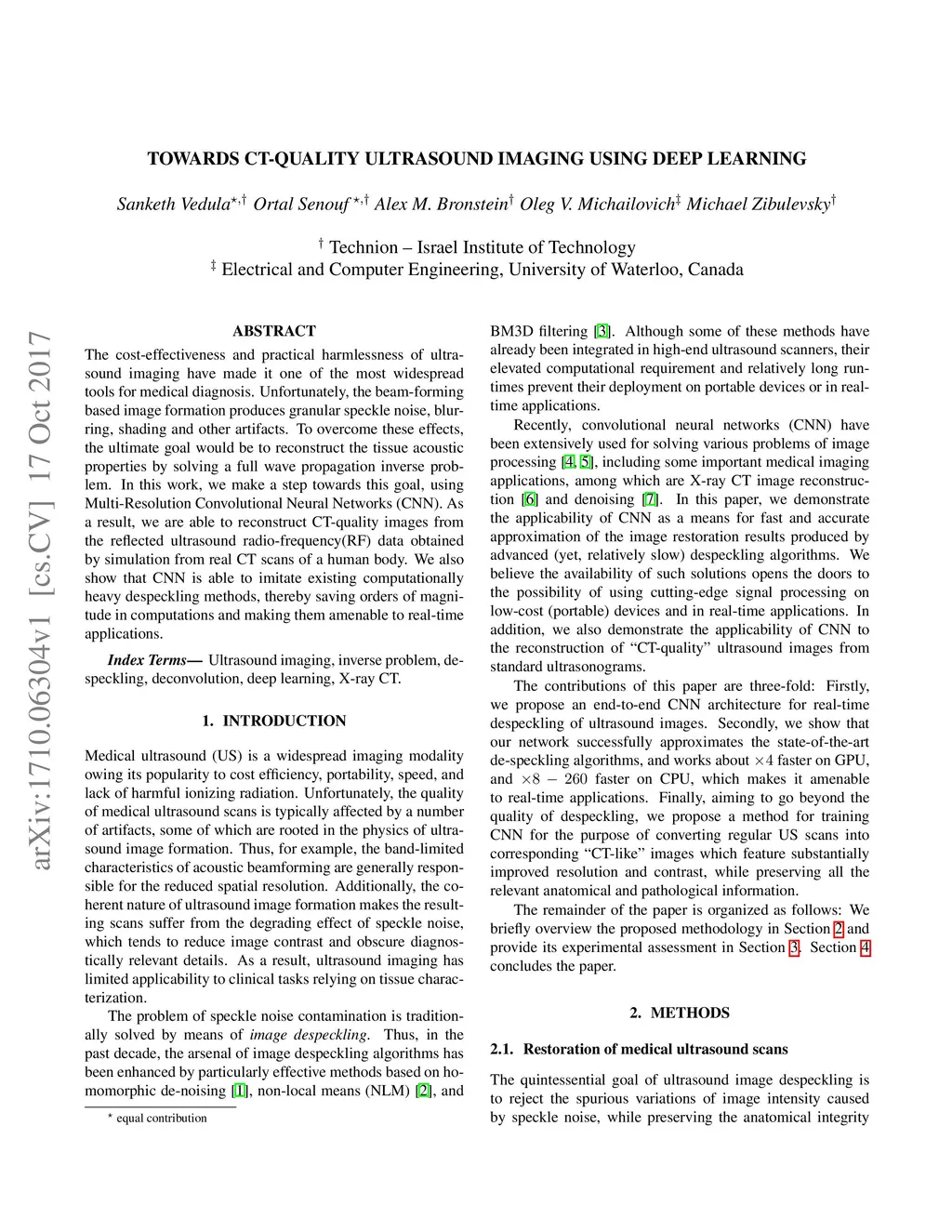 The cost-effectiveness and practical harmlessness of ultrasound imaging have made it one of the most widespread tools for medical diagnosis. Unfortunately, the beam-forming based image formation produces granular speckle noise, blurring, shading and other artifacts. To overcome these effects, the ultimate goal would be to reconstruct the tissue acoustic properties by solving a full wave propagation inverse problem. In this work, we make a step towards this goal, using Multi-Resolution Convolutional Neural Networks (CNN). As a result, we are able to reconstruct CT-quality images from the reflected ultrasound radio-frequency(RF) data obtained by simulation from real CT scans of a human body. We also show that CNN is able to imitate existing computationally heavy despeckling methods, thereby saving orders of magnitude in computations and making them amenable to real-time applications.