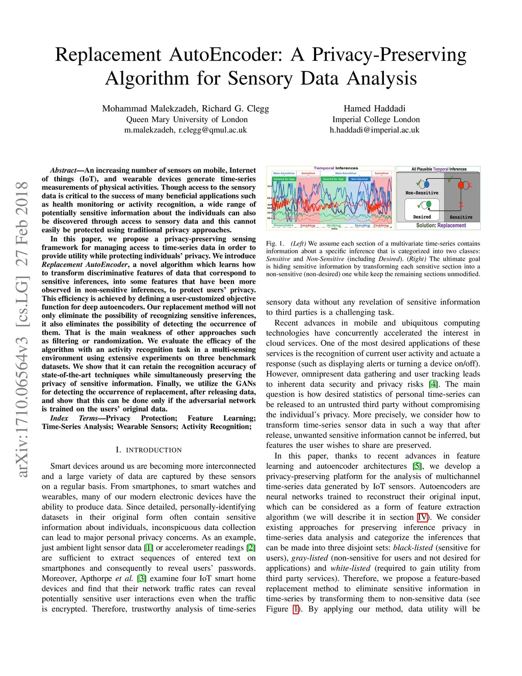 Replacement AutoEncoder: A Privacy-Preserving Algorithm for Sensory Data