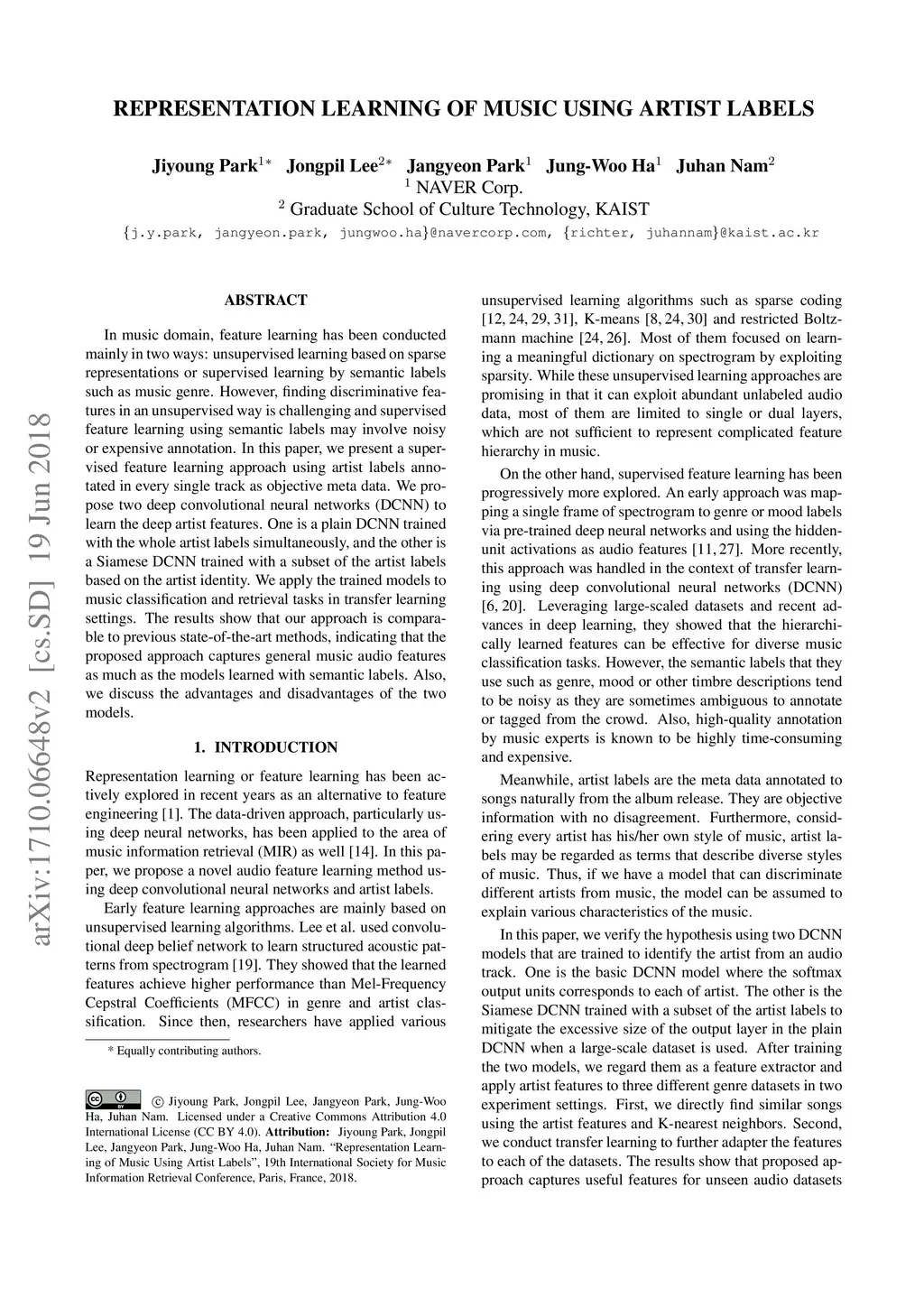 In music domain, feature learning has been conducted mainly in two ways: unsupervised learning based on sparse representations or supervised learning by semantic labels such as music genre. However, finding discriminative features in an unsupervised way is challenging and supervised feature learning using semantic labels may involve noisy or expensive annotation. In this paper, we present a supervised feature learning approach using artist labels annotated in every single track as objective meta data. We propose two deep convolutional neural networks (DCNN) to learn the deep artist features. One is a plain DCNN trained with the whole artist labels simultaneously, and the other is a Siamese DCNN trained with a subset of the artist labels based on the artist identity. We apply the trained models to music classification and retrieval tasks in transfer learning settings. The results show that our approach is comparable to previous state-of-the-art methods, indicating that the proposed approach captures general music audio features as much as the models learned with semantic labels. Also, we discuss the advantages and disadvantages of the two models.