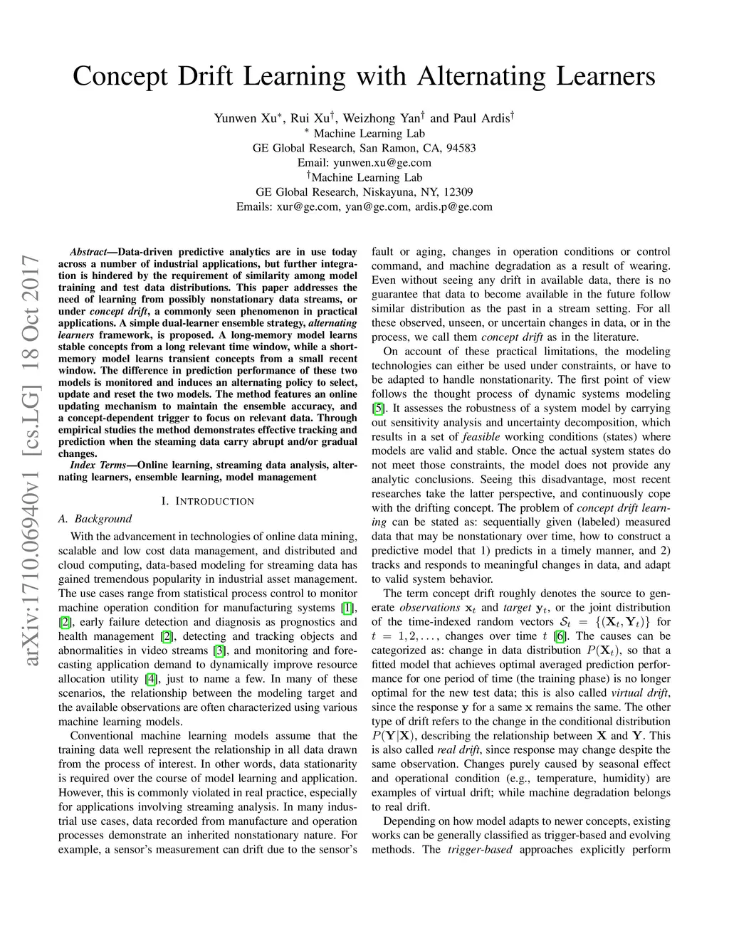 Data-driven predictive analytics are in use today across a number of industrial applications, but further integration is hindered by the requirement of similarity among model training and test data distributions. This paper addresses the need of learning from possibly nonstationary data streams, or under concept drift, a commonly seen phenomenon in practical applications. A simple dual-learner ensemble strategy, alternating learners framework, is proposed. A long-memory model learns stable concepts from a long relevant time window, while a short-memory model learns transient concepts from a small recent window. The difference in prediction performance of these two models is monitored and induces an alternating policy to select, update and reset the two models. The method features an online updating mechanism to maintain the ensemble accuracy, and a concept-dependent trigger to focus on relevant data. Through empirical studies the method demonstrates effective tracking and prediction when the steaming data carry abrupt and/or gradual changes.