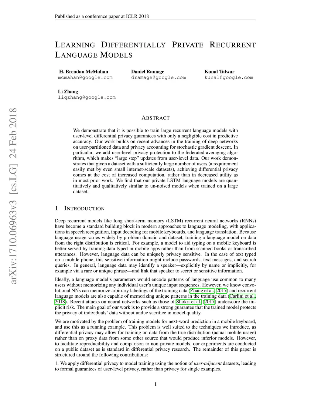 We demonstrate that it is possible to train large recurrent language models with user-level differential privacy guarantees with only a negligible cost in predictive accuracy. Our work builds on recent advances in the training of deep networks on user-partitioned data and privacy accounting for stochastic gradient descent. In particular, we add user-level privacy protection to the federated averaging algorithm, which makes "large step" updates from user-level data. Our work demonstrates that given a dataset with a sufficiently large number of users (a requirement easily met by even small internet-scale datasets), achieving differential privacy comes at the cost of increased computation, rather than in decreased utility as in most prior work. We find that our private LSTM language models are quantitatively and qualitatively similar to un-noised models when trained on a large dataset.