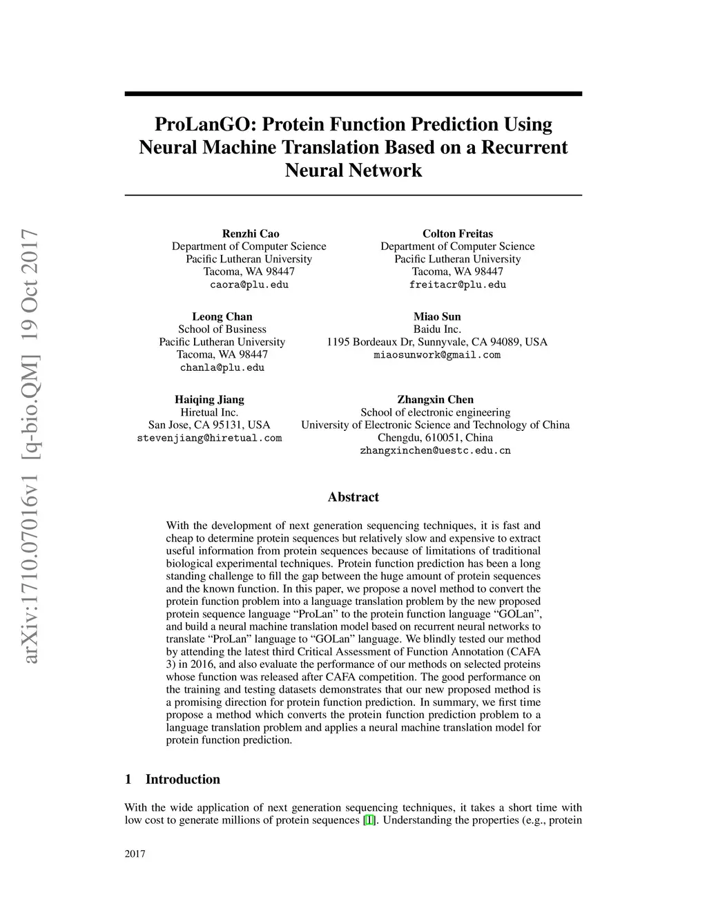 ProLanGO: Protein Function Prediction Using Neural~Machine Translation