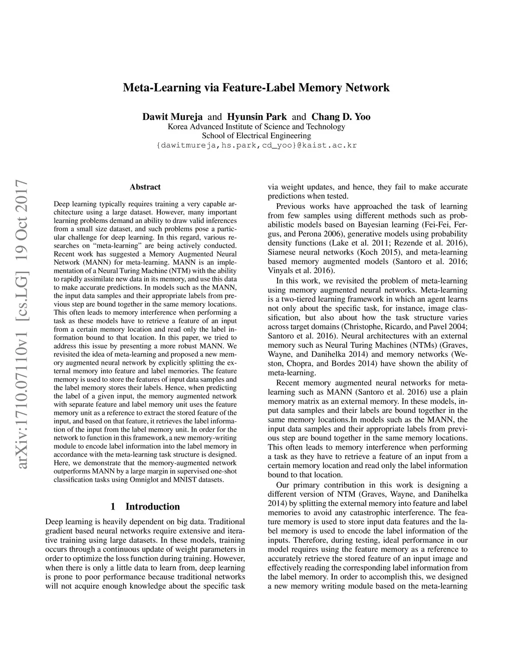 Deep learning typically requires training a very capable architecture using large datasets. However, many important learning problems demand an ability to draw valid inferences from small size datasets, and such problems pose a particular challenge for deep learning. In this regard, various researches on "meta-learning" are being actively conducted. Recent work has suggested a Memory Augmented Neural Network (MANN) for meta-learning. MANN is an implementation of a Neural Turing Machine (NTM) with the ability to rapidly assimilate new data in its memory, and use this data to make accurate predictions. In models such as MANN, the input data samples and their appropriate labels from previous step are bound together in the same memory locations. This often leads to memory interference when performing a task as these models have to retrieve a feature of an input from a certain memory location and read only the label information bound to that location. In this paper, we tried to address this issue by presenting a more robust MANN. We revisited the idea of meta-learning and proposed a new memory augmented neural network by explicitly splitting the external memory into feature and label memories. The feature memory is used to store the features of input data samples and the label memory stores their labels. Hence, when predicting the label of a given input, our model uses its feature memory unit as a reference to extract the stored feature of the input, and based on that feature, it retrieves the label information of the input from the label memory unit. In order for the network to function in this framework, a new memory-writingmodule to encode label information into the label memory in accordance with the meta-learning task structure is designed. Here, we demonstrate that our model outperforms MANN by a large margin in supervised one-shot classification tasks using Omniglot and MNIST datasets.
