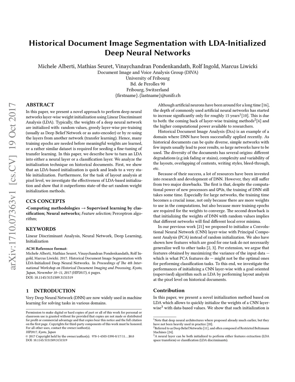Historical Document Image Segmentation with LDA-Initialized Deep Neural