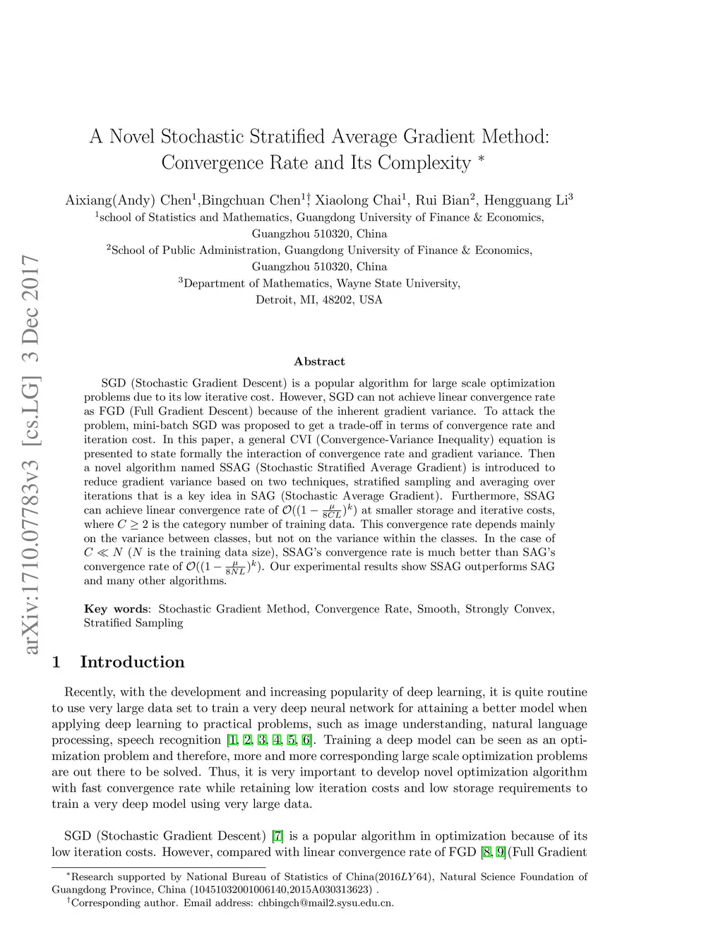 SGD (Stochastic Gradient Descent) is a popular algorithm for large scale optimization problems due to its low iterative cost. However, SGD can not achieve linear convergence rate as FGD (Full Gradient Descent) because of the inherent gradient variance. To attack the problem, mini-batch SGD was proposed to get a trade-off in terms of convergence rate and iteration cost. In this paper, a general CVI (Convergence-Variance Inequality) equation is presented to state formally the interaction of convergence rate and gradient variance. Then a novel algorithm named SSAG (Stochastic Stratified Average Gradient) is introduced to reduce gradient variance based on two techniques, stratified sampling and averaging over iterations that is a key idea in SAG (Stochastic Average Gradient). Furthermore, SSAG can achieve linear convergence rate of at smaller storage and iterative costs, where is the category number of training data. This convergence rate depends mainly on the variance between classes, but not on the variance within the classes. In the case of ( is the training data size), SSAG's convergence rate is much better than SAG's convergence rate of . Our experimental results show SSAG outperforms SAG and many other algorithms.