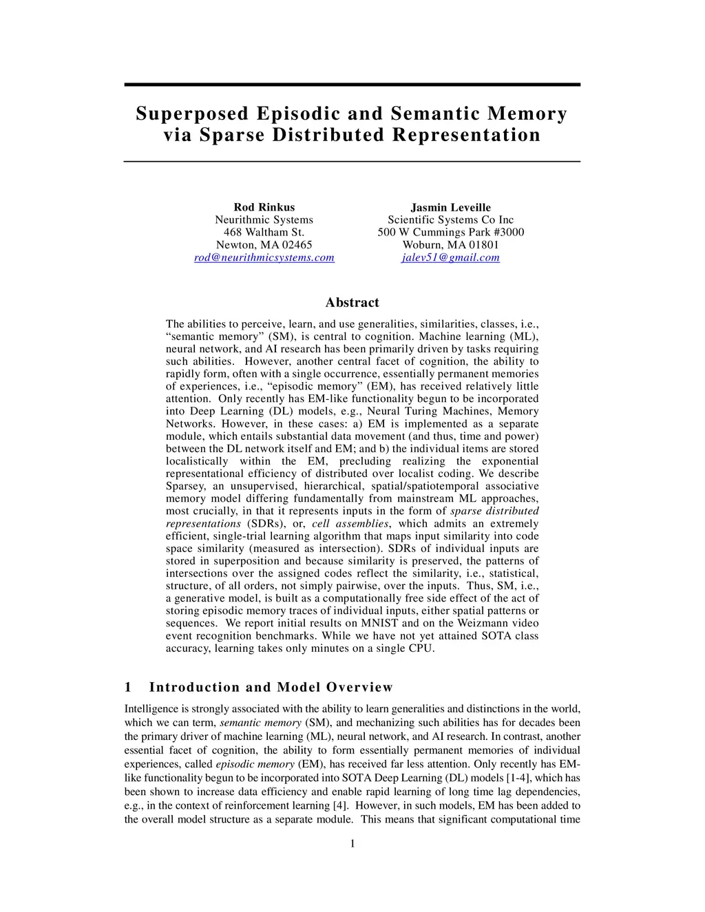 The abilities to perceive, learn, and use generalities, similarities, classes, i.e., semantic memory (SM), is central to cognition. Machine learning (ML), neural network, and AI research has been primarily driven by tasks requiring such abilities. However, another central facet of cognition, single-trial formation of permanent memories of experiences, i.e., episodic memory (EM), has had relatively little focus. Only recently has EM-like functionality been added to Deep Learning (DL) models, e.g., Neural Turing Machine, Memory Networks. However, in these cases: a) EM is implemented as a separate module, which entails substantial data movement (and so, time and power) between the DL net itself and EM; and b) individual items are stored localistically within the EM, precluding realizing the exponential representational efficiency of distributed over localist coding. We describe Sparsey, an unsupervised, hierarchical, spatial/spatiotemporal associative memory model differing fundamentally from mainstream ML models, most crucially, in its use of sparse distributed representations (SDRs), or, cell assemblies, which admits an extremely efficient, single-trial learning algorithm that maps input similarity into code space similarity (measured as intersection). SDRs of individual inputs are stored in superposition and because similarity is preserved, the patterns of intersections over the assigned codes reflect the similarity, i.e., statistical, structure, of all orders, not simply pairwise, over the inputs. Thus, SM, i.e., a generative model, is built as a computationally free side effect of the act of storing episodic memory traces of individual inputs, either spatial patterns or sequences. We report initial results on MNIST and on the Weizmann video event recognition benchmarks. While we have not yet attained SOTA class accuracy, learning takes only minutes on a single CPU.