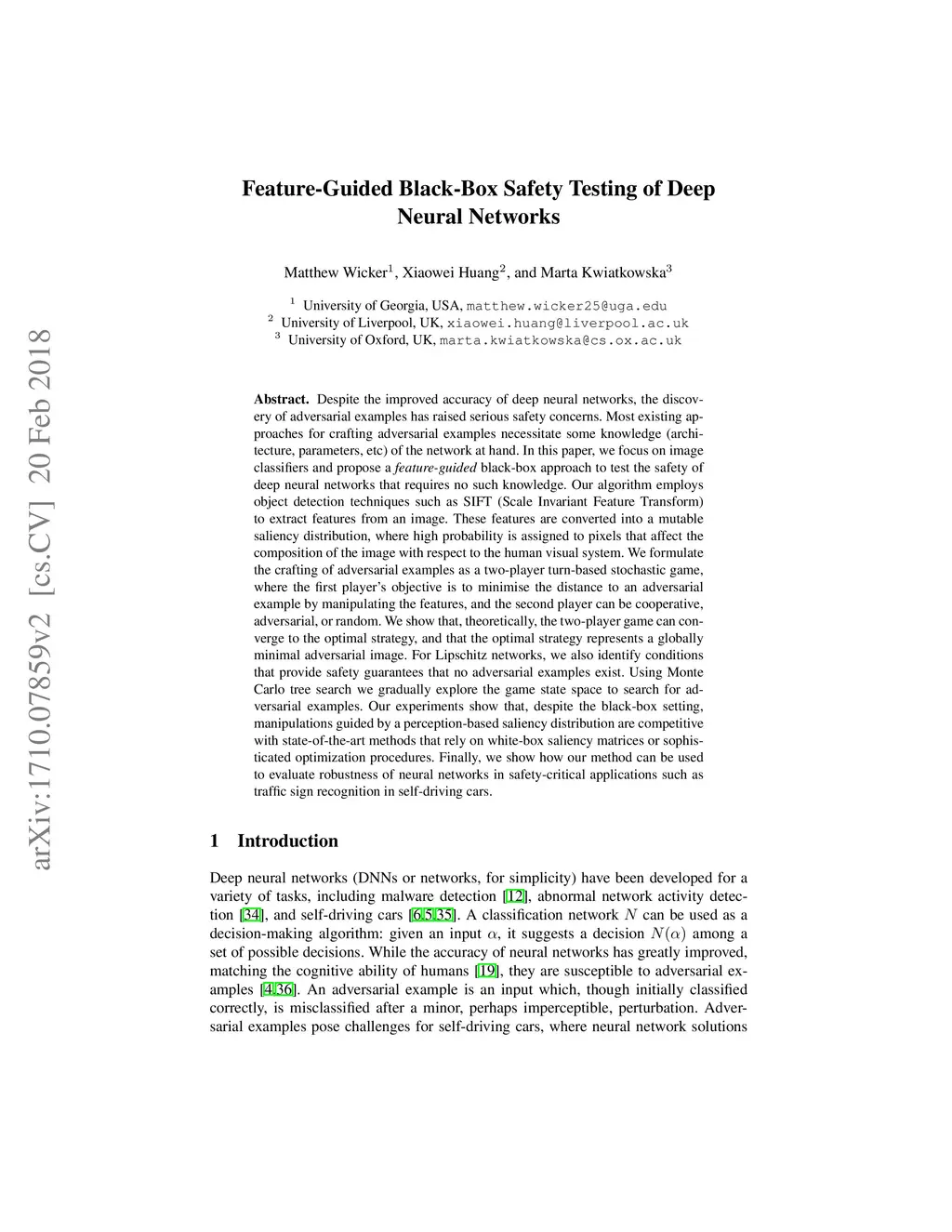 Despite the improved accuracy of deep neural networks, the discovery of adversarial examples has raised serious safety concerns. Most existing approaches for crafting adversarial examples necessitate some knowledge (architecture, parameters, etc.) of the network at hand. In this paper, we focus on image classifiers and propose a feature-guided black-box approach to test the safety of deep neural networks that requires no such knowledge. Our algorithm employs object detection techniques such as SIFT (Scale Invariant Feature Transform) to extract features from an image. These features are converted into a mutable saliency distribution, where high probability is assigned to pixels that affect the composition of the image with respect to the human visual system. We formulate the crafting of adversarial examples as a two-player turn-based stochastic game, where the first player's objective is to minimise the distance to an adversarial example by manipulating the features, and the second player can be cooperative, adversarial, or random. We show that, theoretically, the two-player game can con- verge to the optimal strategy, and that the optimal strategy represents a globally minimal adversarial image. For Lipschitz networks, we also identify conditions that provide safety guarantees that no adversarial examples exist. Using Monte Carlo tree search we gradually explore the game state space to search for adversarial examples. Our experiments show that, despite the black-box setting, manipulations guided by a perception-based saliency distribution are competitive with state-of-the-art methods that rely on white-box saliency matrices or sophisticated optimization procedures. Finally, we show how our method can be used to evaluate robustness of neural networks in safety-critical applications such as traffic sign recognition in self-driving cars.