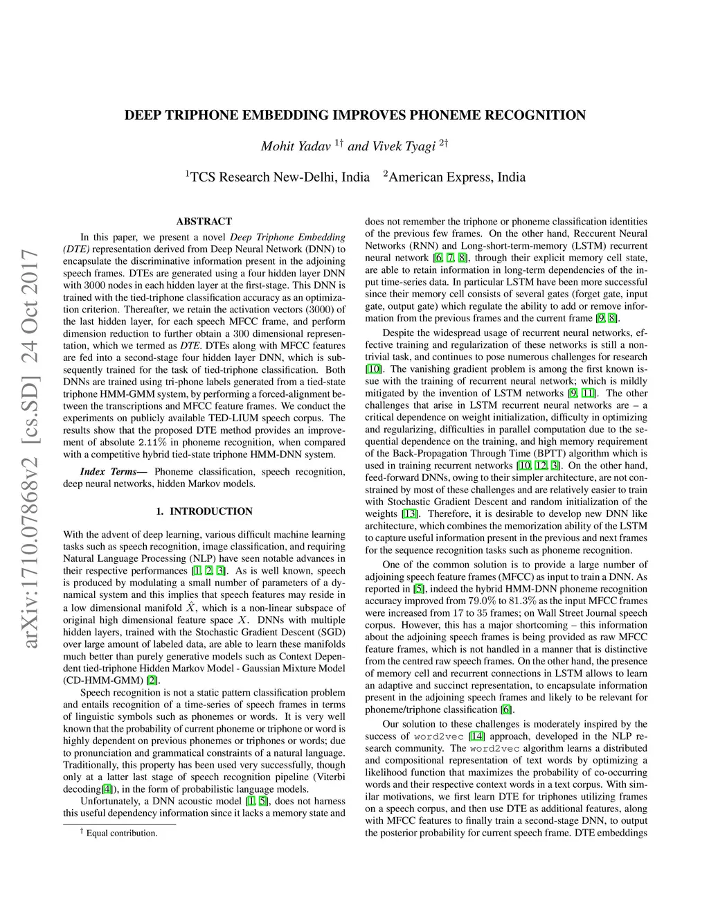 In this paper, we present a novel Deep Triphone Embedding (DTE) representation derived from Deep Neural Network (DNN) to encapsulate the discriminative information present in the adjoining speech frames. DTEs are generated using a four hidden layer DNN with 3000 nodes in each hidden layer at the first-stage. This DNN is trained with the tied-triphone classification accuracy as an optimization criterion. Thereafter, we retain the activation vectors (3000) of the last hidden layer, for each speech MFCC frame, and perform dimension reduction to further obtain a 300 dimensional representation, which we termed as DTE. DTEs along with MFCC features are fed into a second-stage four hidden layer DNN, which is subsequently trained for the task of tied-triphone classification. Both DNNs are trained using tri-phone labels generated from a tied-state triphone HMM-GMM system, by performing a forced-alignment between the transcriptions and MFCC feature frames. We conduct the experiments on publicly available TED-LIUM speech corpus. The results show that the proposed DTE method provides an improvement of absolute 2.11% in phoneme recognition, when compared with a competitive hybrid tied-state triphone HMM-DNN system.