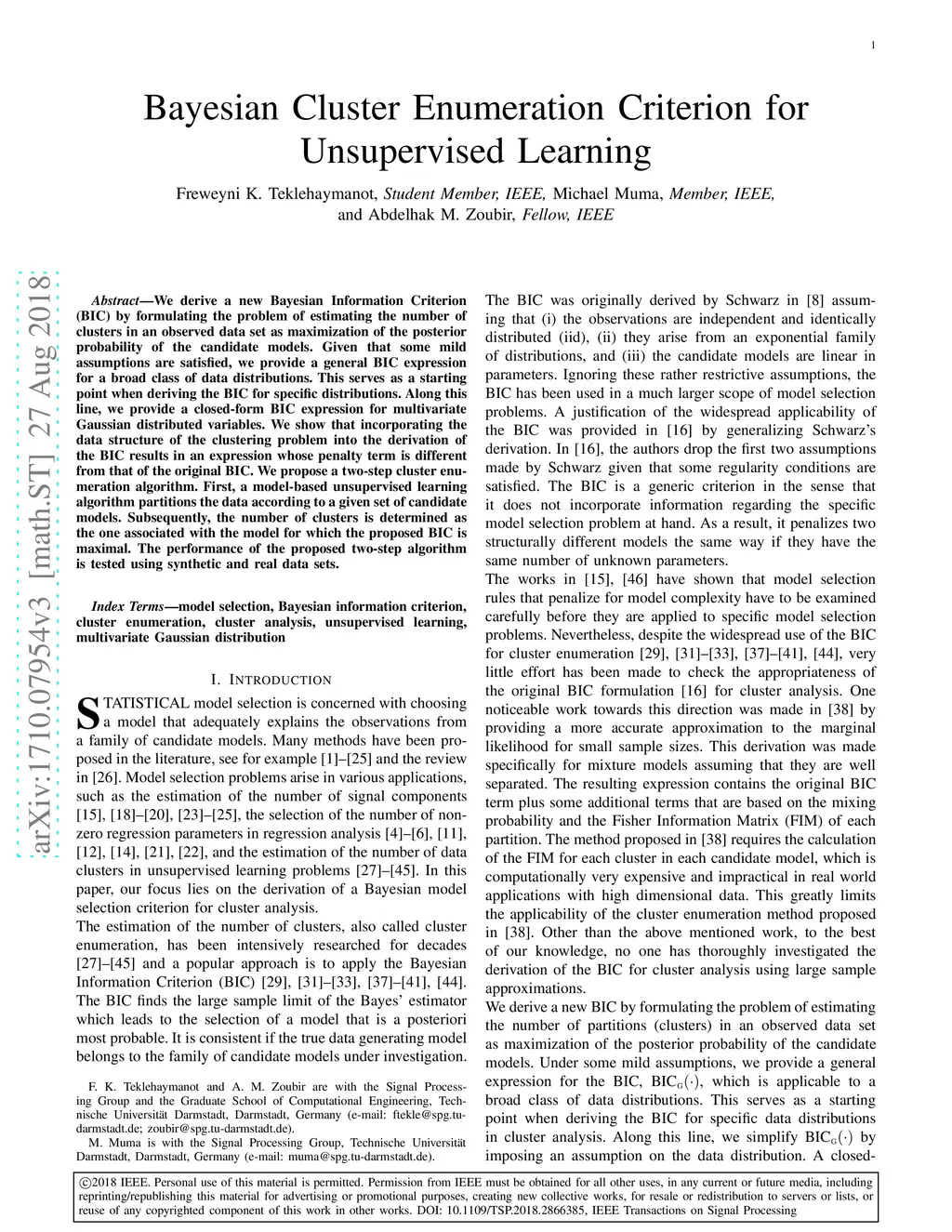 We derive a new Bayesian Information Criterion (BIC) by formulating the problem of estimating the number of clusters in an observed data set as maximization of the posterior probability of the candidate models. Given that some mild assumptions are satisfied, we provide a general BIC expression for a broad class of data distributions. This serves as a starting point when deriving the BIC for specific distributions. Along this line, we provide a closed-form BIC expression for multivariate Gaussian distributed variables. We show that incorporating the data structure of the clustering problem into the derivation of the BIC results in an expression whose penalty term is different from that of the original BIC. We propose a two-step cluster enumeration algorithm. First, a model-based unsupervised learning algorithm partitions the data according to a given set of candidate models. Subsequently, the number of clusters is determined as the one associated with the model for which the proposed BIC is maximal. The performance of the proposed two-step algorithm is tested using synthetic and real data sets.