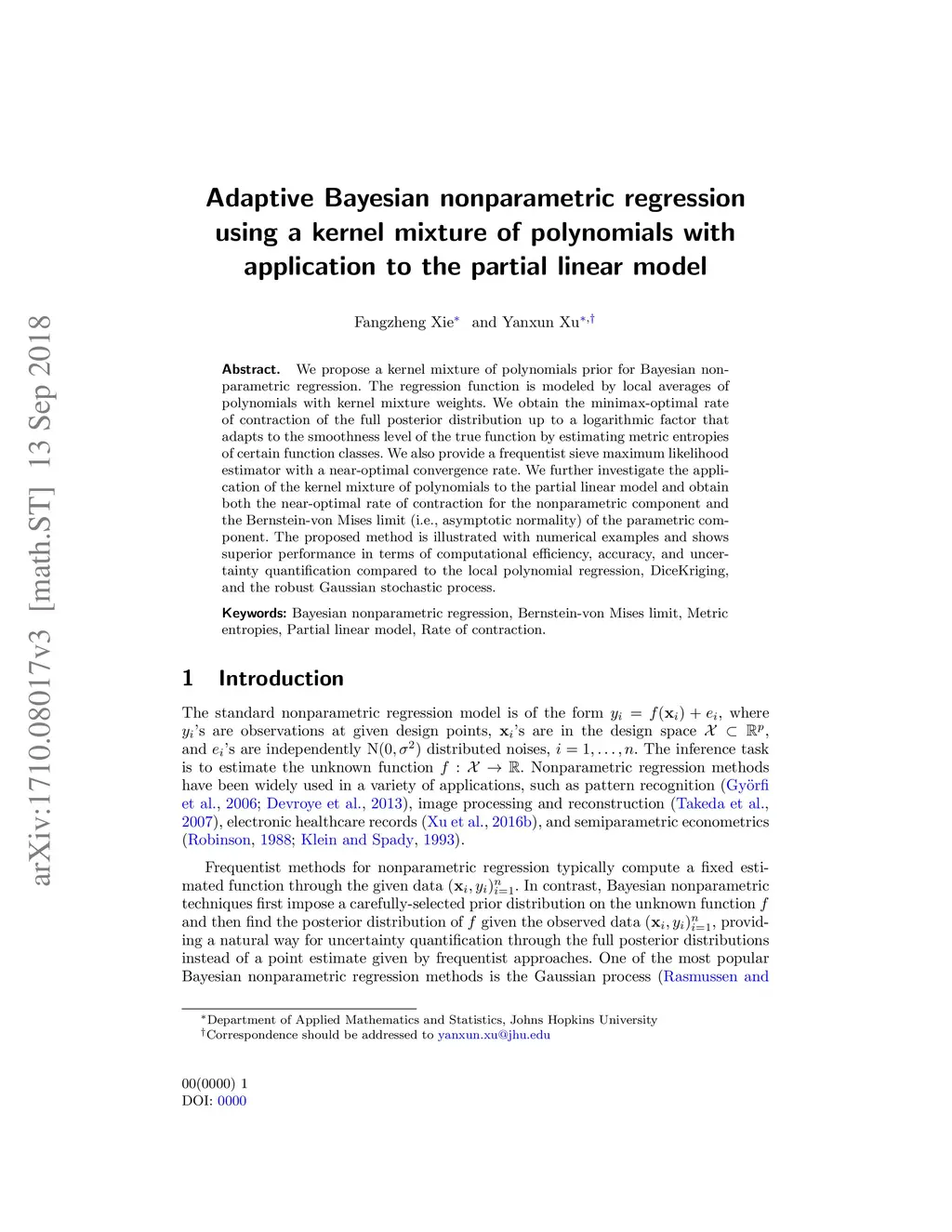 We propose a kernel mixture of polynomials prior for Bayesian nonparametric regression. The regression function is modeled by local averages of polynomials with kernel mixture weights. We obtain the minimax-optimal rate of contraction of the full posterior distribution up to a logarithmic factor that adapts to the smoothness level of the true function by estimating metric entropies of certain function classes. We also provide a frequentist sieve maximum likelihood estimator with a near-optimal convergence rate. We further investigate the application of the kernel mixture of polynomials to the partial linear model and obtain both the near-optimal rate of contraction for the nonparametric component and the Bernstein-von Mises limit (i.e., asymptotic normality) of the parametric component. The proposed method is illustrated with numerical examples and shows superior performance in terms of computational efficiency, accuracy, and uncertainty quantification compared to the local polynomial regression, DiceKriging, and the robust Gaussian stochastic process.