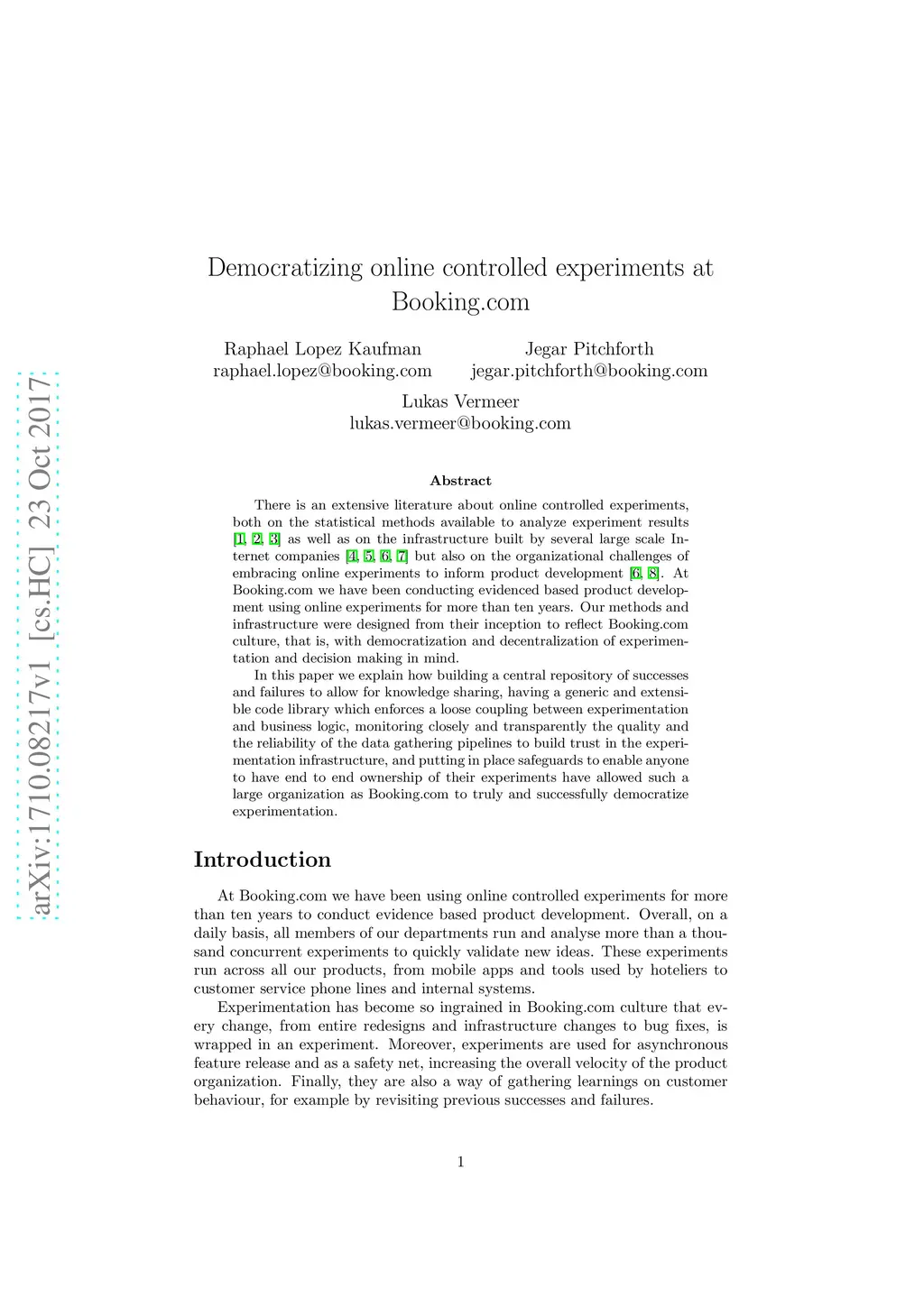 There is an extensive literature about online controlled experiments, both on the statistical methods available to analyze experiment results as well as on the infrastructure built by several large scale Internet companies but also on the organizational challenges of embracing online experiments to inform product development. At Booking.com we have been conducting evidenced based product development using online experiments for more than ten years. Our methods and infrastructure were designed from their inception to reflect Booking.com culture, that is, with democratization and decentralization of experimentation and decision making in mind. In this paper we explain how building a central repository of successes and failures to allow for knowledge sharing, having a generic and extensible code library which enforces a loose coupling between experimentation and business logic, monitoring closely and transparently the quality and the reliability of the data gathering pipelines to build trust in the experimentation infrastructure, and putting in place safeguards to enable anyone to have end to end ownership of their experiments have allowed such a large organization as Booking.com to truly and successfully democratize experimentation.