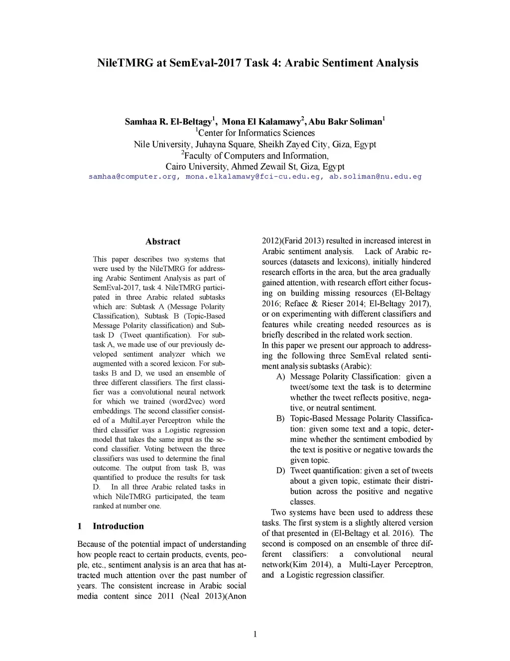 This paper describes two systems that were used by the authors for addressing Arabic Sentiment Analysis as part of SemEval-2017, task 4. The authors participated in three Arabic related subtasks which are: Subtask A (Message Polarity Classification), Sub-task B (Topic-Based Message Polarity classification) and Subtask D (Tweet quantification) using the team name of NileTMRG. For subtask A, we made use of our previously developed sentiment analyzer which we augmented with a scored lexicon. For subtasks B and D, we used an ensemble of three different classifiers. The first classifier was a convolutional neural network for which we trained (word2vec) word embeddings. The second classifier consisted of a MultiLayer Perceptron, while the third classifier was a Logistic regression model that takes the same input as the second classifier. Voting between the three classifiers was used to determine the final outcome. The output from task B, was quantified to produce the results for task D. In all three Arabic related tasks in which NileTMRG participated, the team ranked at number one.