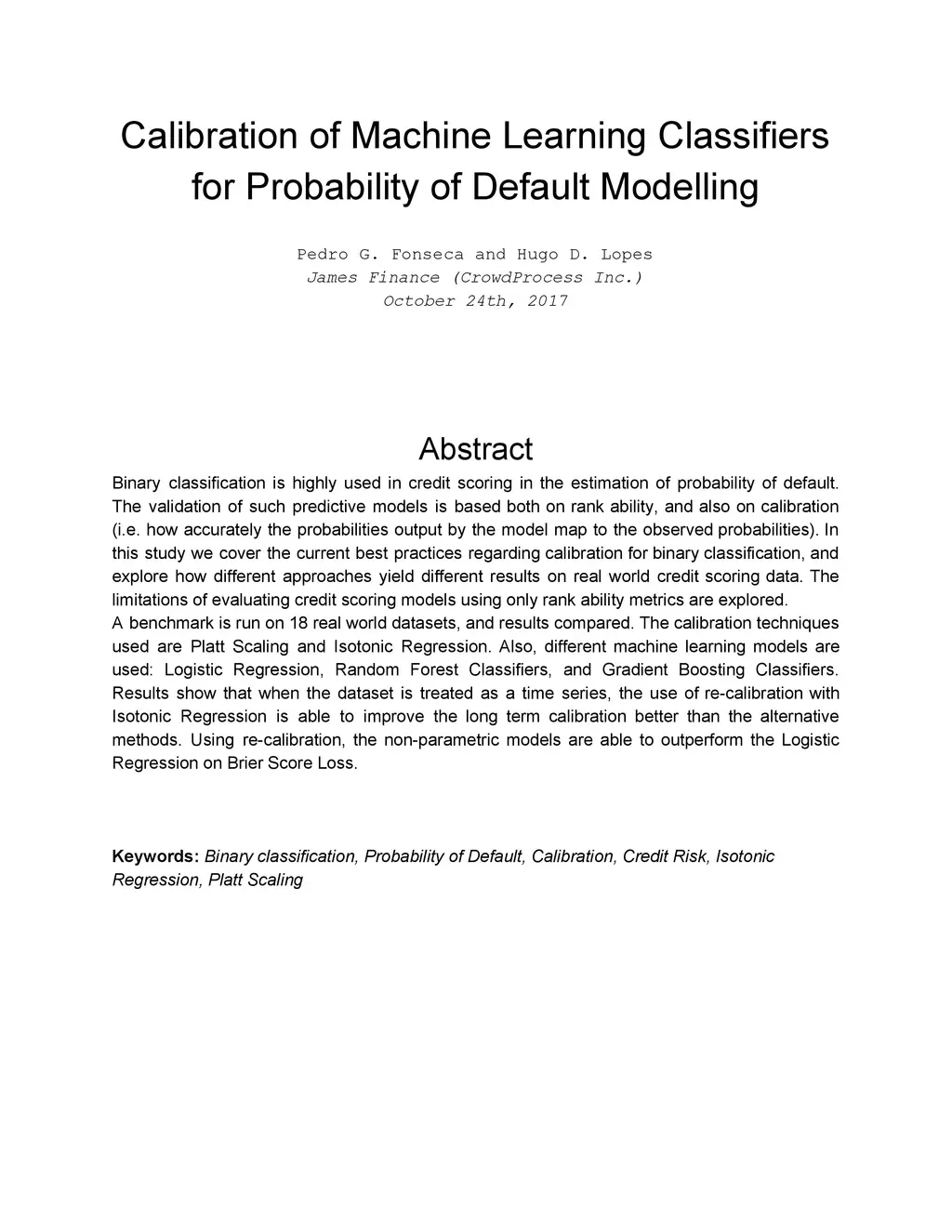 Calibration of Machine Learning Classifiers for Probability of Default
