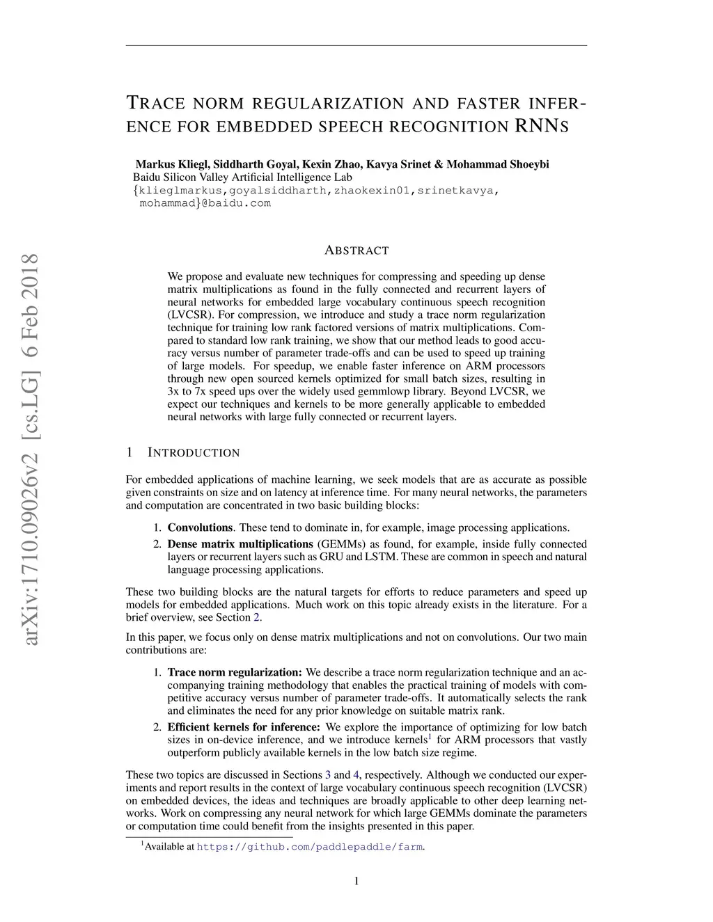 We propose and evaluate new techniques for compressing and speeding up dense matrix multiplications as found in the fully connected and recurrent layers of neural networks for embedded large vocabulary continuous speech recognition (LVCSR). For compression, we introduce and study a trace norm regularization technique for training low rank factored versions of matrix multiplications. Compared to standard low rank training, we show that our method leads to good accuracy versus number of parameter trade-offs and can be used to speed up training of large models. For speedup, we enable faster inference on ARM processors through new open sourced kernels optimized for small batch sizes, resulting in 3x to 7x speed ups over the widely used gemmlowp library. Beyond LVCSR, we expect our techniques and kernels to be more generally applicable to embedded neural networks with large fully connected or recurrent layers.