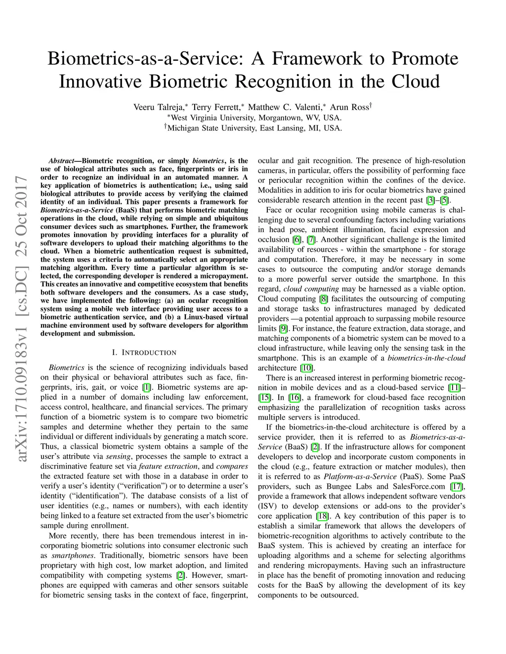 Biometric recognition, or simply biometrics, is the use of biological attributes such as face, fingerprints or iris in order to recognize an individual in an automated manner. A key application of biometrics is authentication; i.e., using said biological attributes to provide access by verifying the claimed identity of an individual. This paper presents a framework for Biometrics-as-a-Service (BaaS) that performs biometric matching operations in the cloud, while relying on simple and ubiquitous consumer devices such as smartphones. Further, the framework promotes innovation by providing interfaces for a plurality of software developers to upload their matching algorithms to the cloud. When a biometric authentication request is submitted, the system uses a criteria to automatically select an appropriate matching algorithm. Every time a particular algorithm is selected, the corresponding developer is rendered a micropayment. This creates an innovative and competitive ecosystem that benefits both software developers and the consumers. As a case study, we have implemented the following: (a) an ocular recognition system using a mobile web interface providing user access to a biometric authentication service, and (b) a Linux-based virtual machine environment used by software developers for algorithm development and submission.