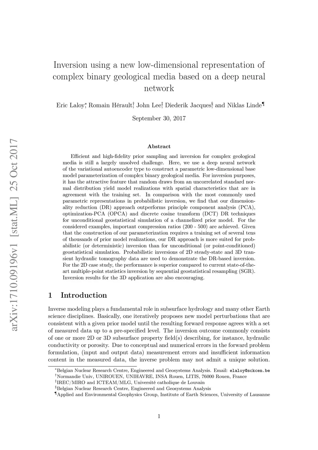Efficient and high-fidelity prior sampling and inversion for complex geological media is still a largely unsolved challenge. Here, we use a deep neural network of the variational autoencoder type to construct a parametric low-dimensional base model parameterization of complex binary geological media. For inversion purposes, it has the attractive feature that random draws from an uncorrelated standard normal distribution yield model realizations with spatial characteristics that are in agreement with the training set. In comparison with the most commonly used parametric representations in probabilistic inversion, we find that our dimensionality reduction (DR) approach outperforms principle component analysis (PCA), optimization-PCA (OPCA) and discrete cosine transform (DCT) DR techniques for unconditional geostatistical simulation of a channelized prior model. For the considered examples, important compression ratios (200 - 500) are achieved. Given that the construction of our parameterization requires a training set of several tens of thousands of prior model realizations, our DR approach is more suited for probabilistic (or deterministic) inversion than for unconditional (or point-conditioned) geostatistical simulation. Probabilistic inversions of 2D steady-state and 3D transient hydraulic tomography data are used to demonstrate the DR-based inversion. For the 2D case study, the performance is superior compared to current state-of-the-art multiple-point statistics inversion by sequential geostatistical resampling (SGR). Inversion results for the 3D application are also encouraging.