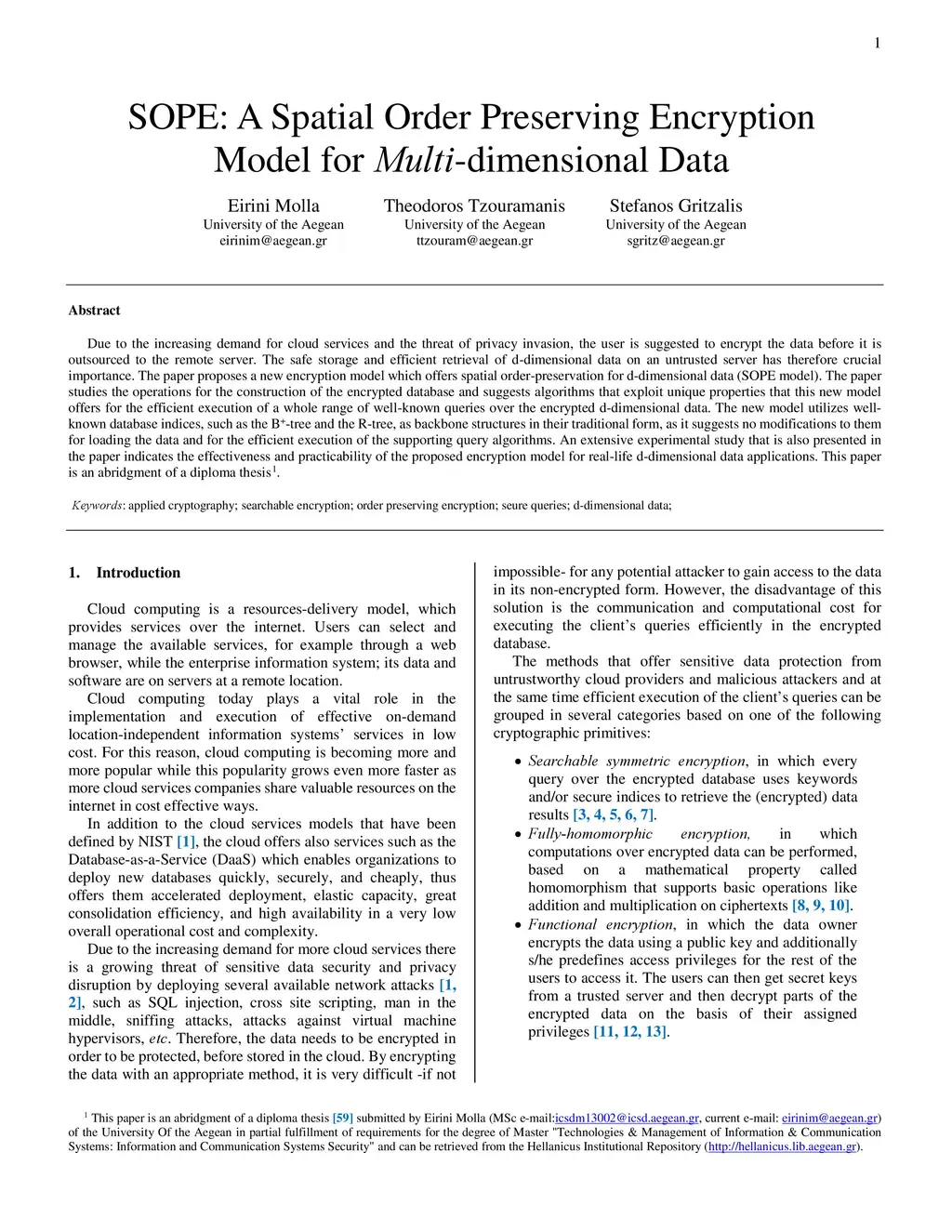 Due to the increasing demand for cloud services and the threat of privacy invasion, the user is suggested to encrypt the data before it is outsourced to the remote server. The safe storage and efficient retrieval of d-dimensional data on an untrusted server has therefore crucial importance. The paper proposes a new encryption model which offers spatial order-preservation for d-dimensional data (SOPE model). The paper studies the operations for the construction of the encrypted database and suggests algorithms that exploit unique properties that this new model offers for the efficient execution of a whole range of well-known queries over the encrypted d-dimensional data. The new model utilizes well-known database indices, such as the B+-tree and the R-tree, as backbone structures in their traditional form, as it suggests no modifications to them for loading the data and for the efficient execution of the supporting query algorithms. An extensive experimental study that is also presented in the paper indicates the effectiveness and practicability of the proposed encryption model for real-life d-dimensional data applications.