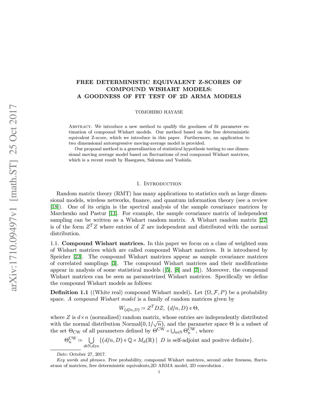 We introduce a new method to qualify the goodness of fit parameter estimation of compound Wishart models. Our method based on the free deterministic equivalent Z-score, which we introduce in this paper. Furthermore, an application to two dimensional autoregressive moving-average model is provided. Our proposal method is a generalization of statistical hypothesis testing to one dimensional moving average model based on fluctuations of real compound Wishart matrices, which is a recent result by Hasegawa, Sakuma and Yoshida.