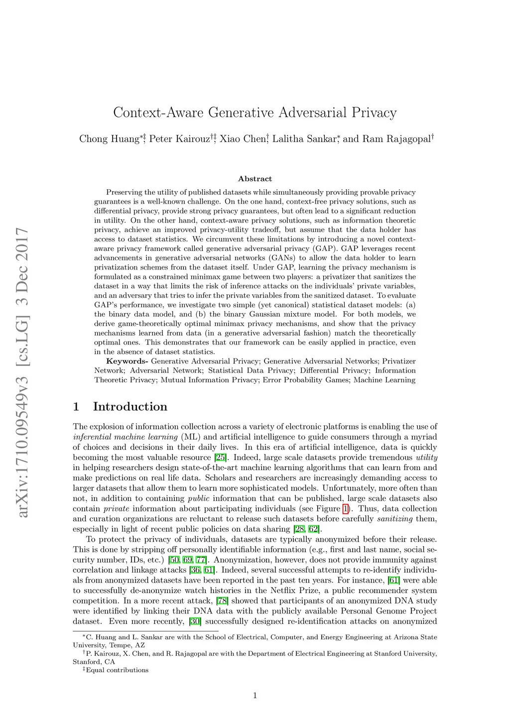 Preserving the utility of published datasets while simultaneously providing provable privacy guarantees is a well-known challenge. On the one hand, context-free privacy solutions, such as differential privacy, provide strong privacy guarantees, but often lead to a significant reduction in utility. On the other hand, context-aware privacy solutions, such as information theoretic privacy, achieve an improved privacy-utility tradeoff, but assume that the data holder has access to dataset statistics. We circumvent these limitations by introducing a novel context-aware privacy framework called generative adversarial privacy (GAP). GAP leverages recent advancements in generative adversarial networks (GANs) to allow the data holder to learn privatization schemes from the dataset itself. Under GAP, learning the privacy mechanism is formulated as a constrained minimax game between two players: a privatizer that sanitizes the dataset in a way that limits the risk of inference attacks on the individuals' private variables, and an adversary that tries to infer the private variables from the sanitized dataset. To evaluate GAP's performance, we investigate two simple (yet canonical) statistical dataset models: (a) the binary data model, and (b) the binary Gaussian mixture model. For both models, we derive game-theoretically optimal minimax privacy mechanisms, and show that the privacy mechanisms learned from data (in a generative adversarial fashion) match the theoretically optimal ones. This demonstrates that our framework can be easily applied in practice, even in the absence of dataset statistics.