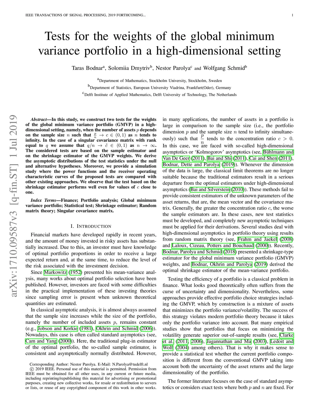 In this study, we construct two tests for the weights of the global minimum variance portfolio (GMVP) in a high-dimensional setting, namely, when the number of assets depends on the sample size such that as tends to infinity. In the case of a singular covariance matrix with rank equal to we assume that as . The considered tests are based on the sample estimator and on the shrinkage estimator of the GMVP weights. We derive the asymptotic distributions of the test statistics under the null and alternative hypotheses. Moreover, we provide a simulation study where the power functions and the receiver operating characteristic curves of the proposed tests are compared with other existing approaches. We observe that the test based on the shrinkage estimator performs well even for values of close to one.