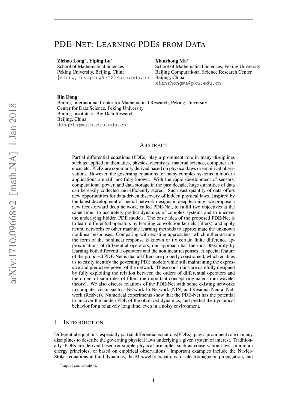 In this paper, we present an initial attempt to learn evolution PDEs from data. Inspired by the latest development of neural network designs in deep learning, we propose a new feed-forward deep network, called PDE-Net, to fulfill two objectives at the same time: to accurately predict dynamics of complex systems and to uncover the underlying hidden PDE models. The basic idea of the proposed PDE-Net is to learn differential operators by learning convolution kernels (filters), and apply neural networks or other machine learning methods to approximate the unknown nonlinear responses. Comparing with existing approaches, which either assume the form of the nonlinear response is known or fix certain finite difference approximations of differential operators, our approach has the most flexibility by learning both differential operators and the nonlinear responses. A special feature of the proposed PDE-Net is that all filters are properly constrained, which enables us to easily identify the governing PDE models while still maintaining the expressive and predictive power of the network. These constrains are carefully designed by fully exploiting the relation between the orders of differential operators and the orders of sum rules of filters (an important concept originated from wavelet theory). We also discuss relations of the PDE-Net with some existing networks in computer vision such as Network-In-Network (NIN) and Residual Neural Network (ResNet). Numerical experiments show that the PDE-Net has the potential to uncover the hidden PDE of the observed dynamics, and predict the dynamical behavior for a relatively long time, even in a noisy environment.