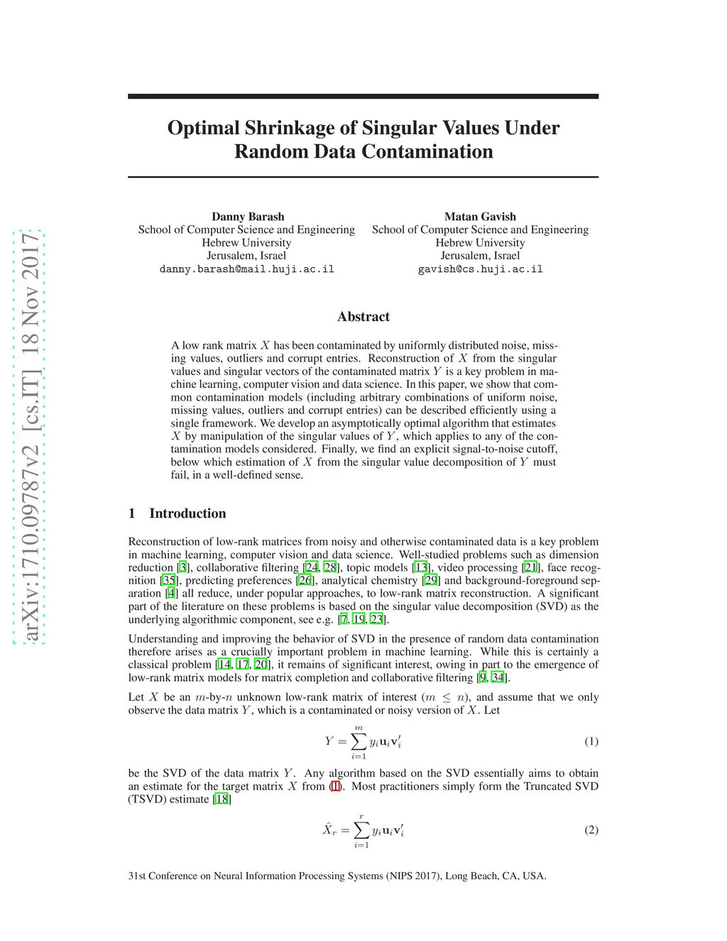 A low rank matrix X has been contaminated by uniformly distributed noise, missing values, outliers and corrupt entries. Reconstruction of X from the singular values and singular vectors of the contaminated matrix Y is a key problem in machine learning, computer vision and data science. In this paper we show that common contamination models (including arbitrary combinations of uniform noise,missing values, outliers and corrupt entries) can be described efficiently using a single framework. We develop an asymptotically optimal algorithm that estimates X by manipulation of the singular values of Y , which applies to any of the contamination models considered. Finally, we find an explicit signal-to-noise cutoff, below which estimation of X from the singular value decomposition of Y must fail, in a well-defined sense.