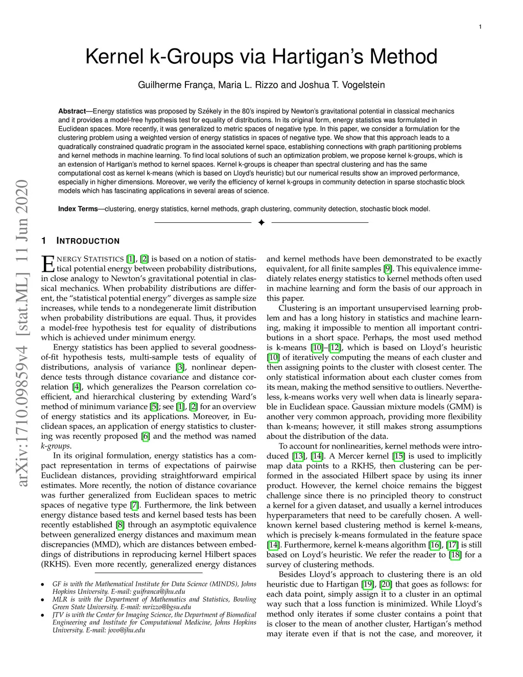 Energy statistics was proposed by Sz\' ekely in the 80's inspired by Newton's gravitational potential in classical mechanics and it provides a model-free hypothesis test for equality of distributions. In its original form, energy statistics was formulated in Euclidean spaces. More recently, it was generalized to metric spaces of negative type. In this paper, we consider a formulation for the clustering problem using a weighted version of energy statistics in spaces of negative type. We show that this approach leads to a quadratically constrained quadratic program in the associated kernel space, establishing connections with graph partitioning problems and kernel methods in machine learning. To find local solutions of such an optimization problem, we propose kernel k-groups, which is an extension of Hartigan's method to kernel spaces. Kernel k-groups is cheaper than spectral clustering and has the same computational cost as kernel k-means (which is based on Lloyd's heuristic) but our numerical results show an improved performance, especially in higher dimensions. Moreover, we verify the efficiency of kernel k-groups in community detection in sparse stochastic block models which has fascinating applications in several areas of science.