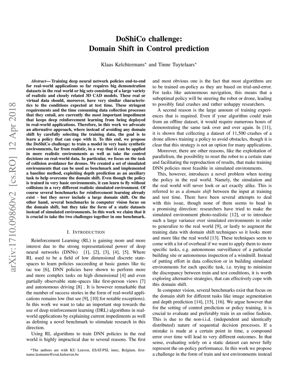 Training deep neural network policies end-to-end for real-world applications so far requires big demonstration datasets in the real world or big sets consisting of a large variety of realistic and closely related 3D CAD models. These real or virtual data should, moreover, have very similar characteristics to the conditions expected at test time. These stringent requirements and the time consuming data collection processes that they entail, are currently the most important impediment that keeps deep reinforcement learning from being deployed in real-world applications. Therefore, in this work we advocate an alternative approach, where instead of avoiding any domain shift by carefully selecting the training data, the goal is to learn a policy that can cope with it. To this end, we propose the DoShiCo challenge: to train a model in very basic synthetic environments, far from realistic, in a way that it can be applied in more realistic environments as well as take the control decisions on real-world data. In particular, we focus on the task of collision avoidance for drones. We created a set of simulated environments that can be used as benchmark and implemented a baseline method, exploiting depth prediction as an auxiliary task to help overcome the domain shift. Even though the policy is trained in very basic environments, it can learn to fly without collisions in a very different realistic simulated environment. Of course several benchmarks for reinforcement learning already exist - but they never include a large domain shift. On the other hand, several benchmarks in computer vision focus on the domain shift, but they take the form of a static datasets instead of simulated environments. In this work we claim that it is crucial to take the two challenges together in one benchmark.