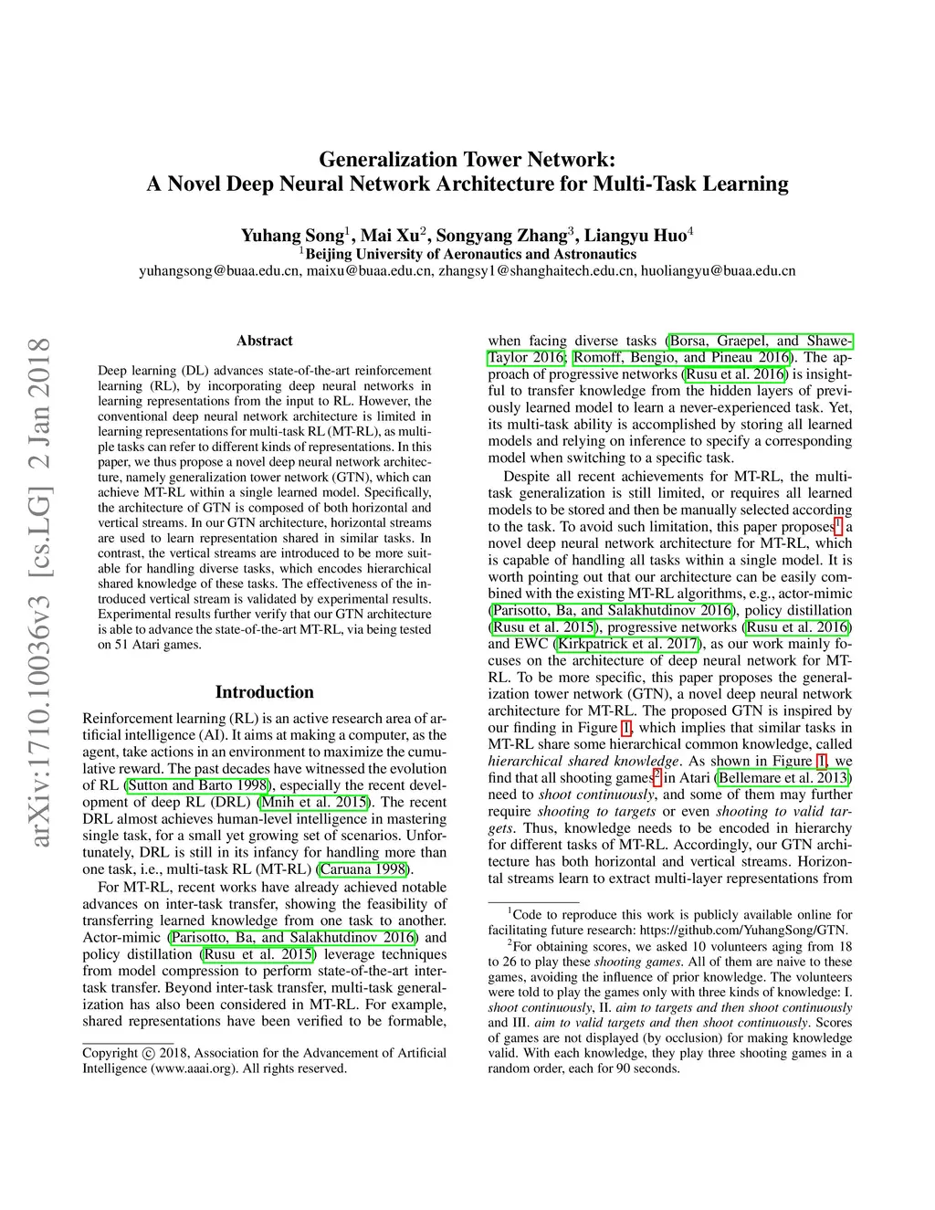 Deep learning (DL) advances state-of-the-art reinforcement learning (RL), by incorporating deep neural networks in learning representations from the input to RL. However, the conventional deep neural network architecture is limited in learning representations for multi-task RL (MT-RL), as multiple tasks can refer to different kinds of representations. In this paper, we thus propose a novel deep neural network architecture, namely generalization tower network (GTN), which can achieve MT-RL within a single learned model. Specifically, the architecture of GTN is composed of both horizontal and vertical streams. In our GTN architecture, horizontal streams are used to learn representation shared in similar tasks. In contrast, the vertical streams are introduced to be more suitable for handling diverse tasks, which encodes hierarchical shared knowledge of these tasks. The effectiveness of the introduced vertical stream is validated by experimental results. Experimental results further verify that our GTN architecture is able to advance the state-of-the-art MT-RL, via being tested on 51 Atari games.