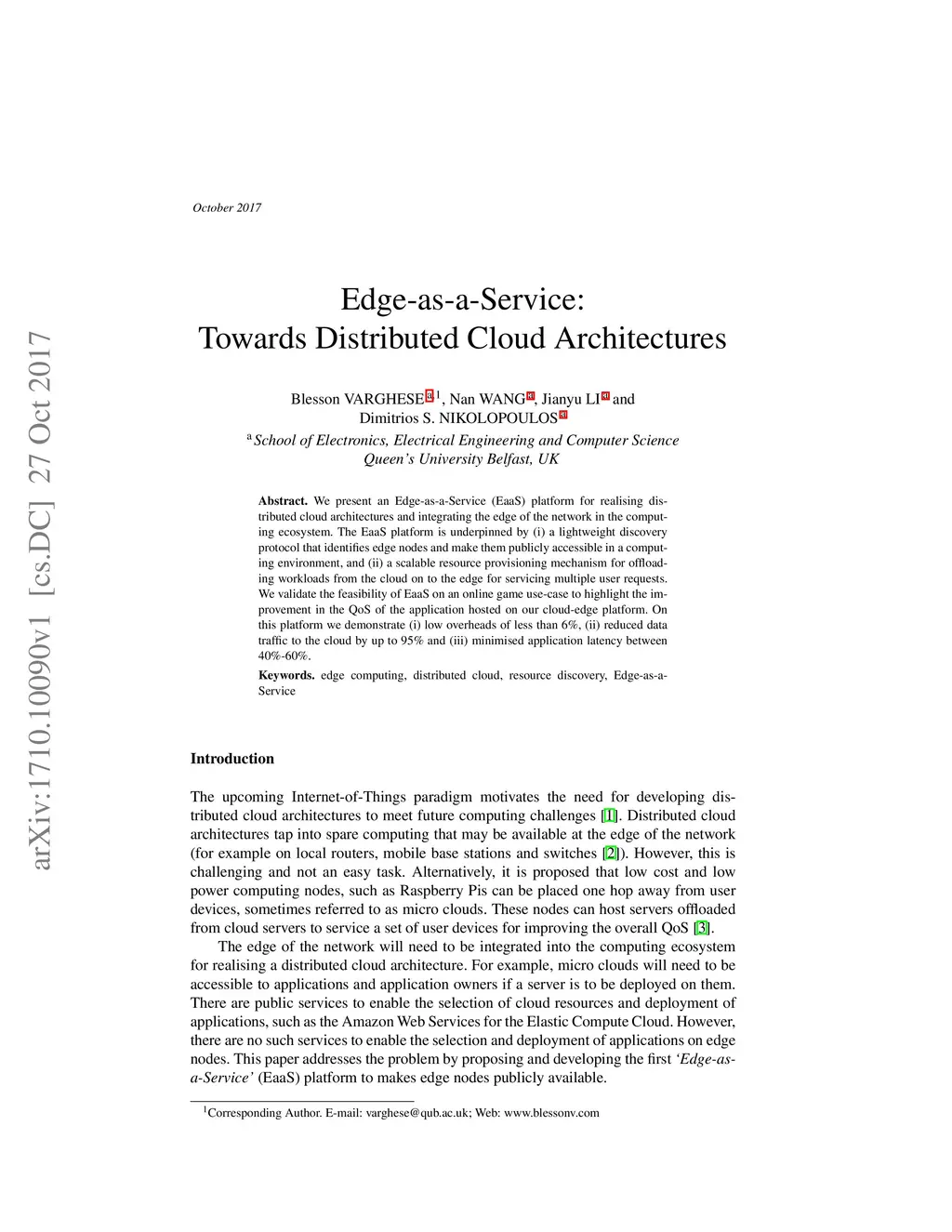 We present an Edge-as-a-Service (EaaS) platform for realising distributed cloud architectures and integrating the edge of the network in the computing ecosystem. The EaaS platform is underpinned by (i) a lightweight discovery protocol that identifies edge nodes and make them publicly accessible in a computing environment, and (ii) a scalable resource provisioning mechanism for offloading workloads from the cloud on to the edge for servicing multiple user requests. We validate the feasibility of EaaS on an online game use-case to highlight the improvement in the QoS of the application hosted on our cloud-edge platform. On this platform we demonstrate (i) low overheads of less than 6%, (ii) reduced data traffic to the cloud by up to 95% and (iii) minimised application latency between 40%-60%.