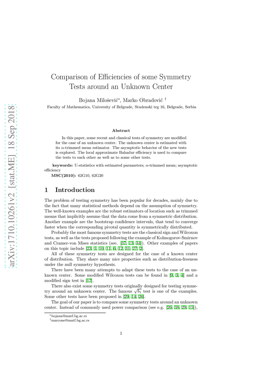 In this paper, some recent and classical tests of symmetry are modified for the case of an unknown center. The unknown center is estimated with its -trimmed mean estimator. The asymptotic behavior of the new tests is explored. The local approximate Bahadur efficiency is used to compare the tests to each other as well as to some other tests.