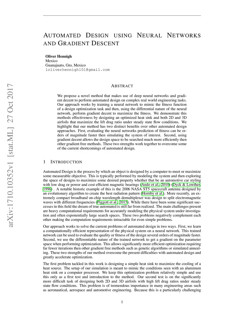 We propose a novel method that makes use of deep neural networks and gradient decent to perform automated design on complex real world engineering tasks. Our approach works by training a neural network to mimic the fitness function of a design optimization task and then, using the differential nature of the neural network, perform gradient decent to maximize the fitness. We demonstrate this methods effectiveness by designing an optimized heat sink and both 2D and 3D airfoils that maximize the lift drag ratio under steady state flow conditions. We highlight that our method has two distinct benefits over other automated design approaches. First, evaluating the neural networks prediction of fitness can be orders of magnitude faster then simulating the system of interest. Second, using gradient decent allows the design space to be searched much more efficiently then other gradient free methods. These two strengths work together to overcome some of the current shortcomings of automated design.