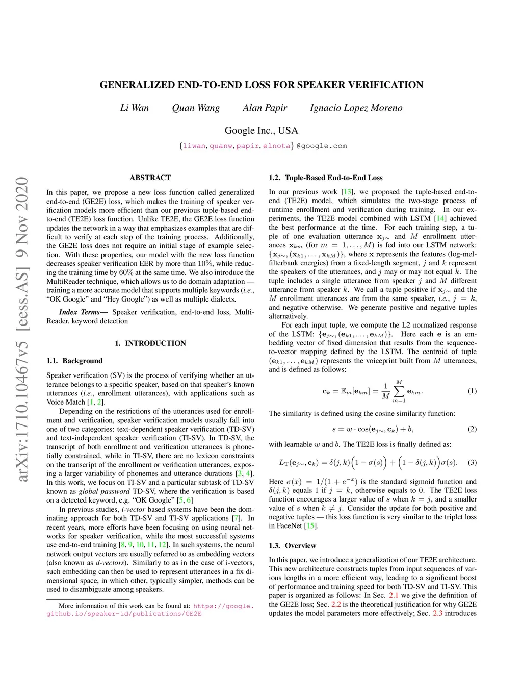 In this paper, we propose a new loss function called generalized end-to-end (GE2E) loss, which makes the training of speaker verification models more efficient than our previous tuple-based end-to-end (TE2E) loss function. Unlike TE2E, the GE2E loss function updates the network in a way that emphasizes examples that are difficult to verify at each step of the training process. Additionally, the GE2E loss does not require an initial stage of example selection. With these properties, our model with the new loss function decreases speaker verification EER by more than 10%, while reducing the training time by 60% at the same time. We also introduce the MultiReader technique, which allows us to do domain adaptation - training a more accurate model that supports multiple keywords (i.e. "OK Google" and "Hey Google") as well as multiple dialects.