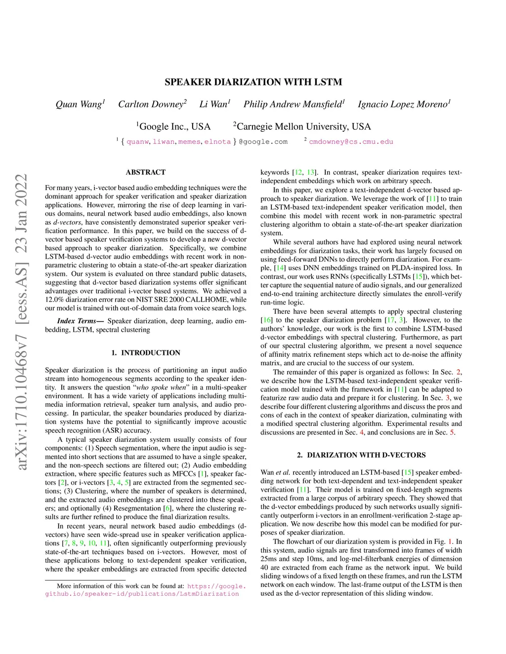 For many years, i-vector based audio embedding techniques were the dominant approach for speaker verification and speaker diarization applications. However, mirroring the rise of deep learning in various domains, neural network based audio embeddings, also known as d-vectors, have consistently demonstrated superior speaker verification performance. In this paper, we build on the success of d-vector based speaker verification systems to develop a new d-vector based approach to speaker diarization. Specifically, we combine LSTM-based d-vector audio embeddings with recent work in non-parametric clustering to obtain a state-of-the-art speaker diarization system. Our system is evaluated on three standard public datasets, suggesting that d-vector based diarization systems offer significant advantages over traditional i-vector based systems. We achieved a 12.0% diarization error rate on NIST SRE 2000 CALLHOME, while our model is trained with out-of-domain data from voice search logs.