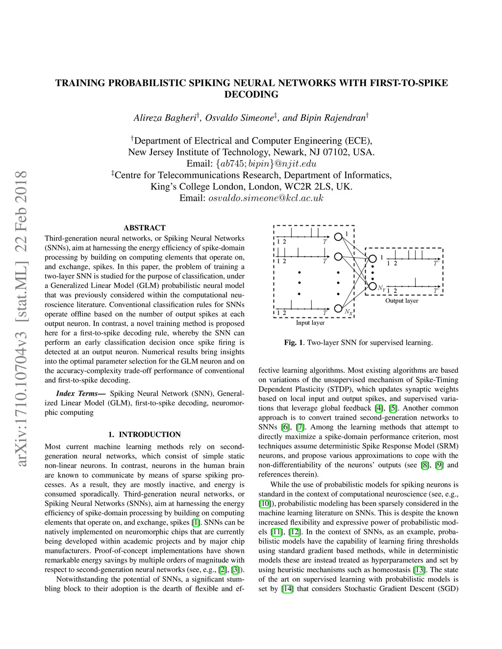 Third-generation neural networks, or Spiking Neural Networks (SNNs), aim at harnessing the energy efficiency of spike-domain processing by building on computing elements that operate on, and exchange, spikes. In this paper, the problem of training a two-layer SNN is studied for the purpose of classification, under a Generalized Linear Model (GLM) probabilistic neural model that was previously considered within the computational neuroscience literature. Conventional classification rules for SNNs operate offline based on the number of output spikes at each output neuron. In contrast, a novel training method is proposed here for a first-to-spike decoding rule, whereby the SNN can perform an early classification decision once spike firing is detected at an output neuron. Numerical results bring insights into the optimal parameter selection for the GLM neuron and on the accuracy-complexity trade-off performance of conventional and first-to-spike decoding.