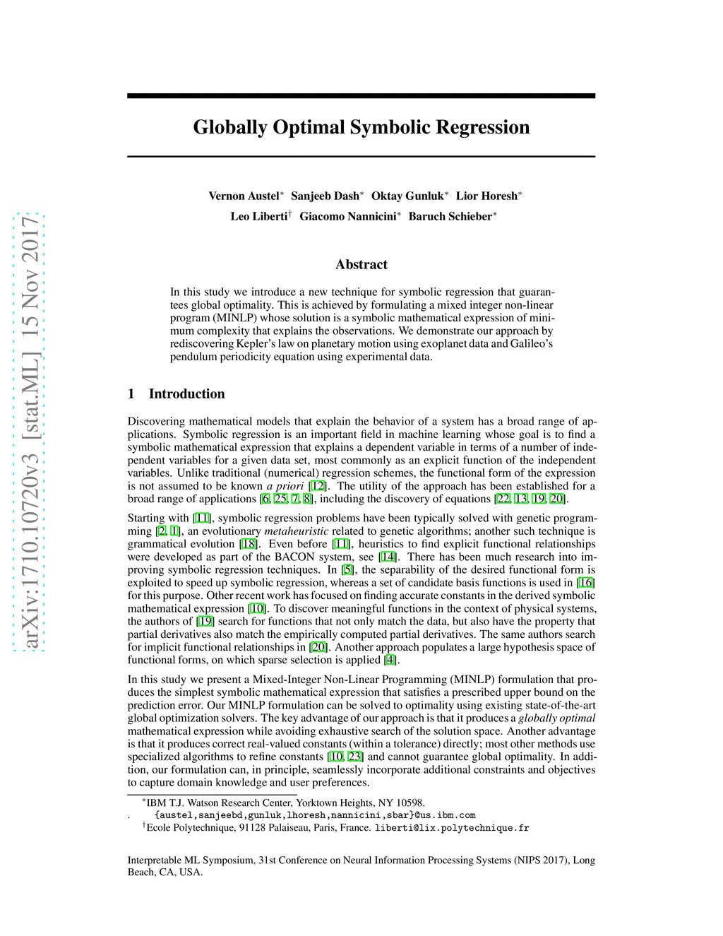 In this study we introduce a new technique for symbolic regression that guarantees global optimality. This is achieved by formulating a mixed integer non-linear program (MINLP) whose solution is a symbolic mathematical expression of minimum complexity that explains the observations. We demonstrate our approach by rediscovering Kepler's law on planetary motion using exoplanet data and Galileo's pendulum periodicity equation using experimental data.