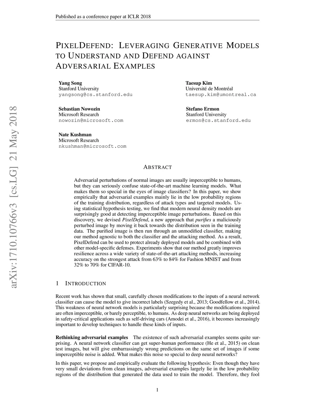 PixelDefend: Leveraging Generative Models to Understand and Defend
