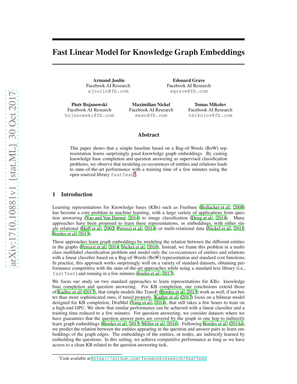 This paper shows that a simple baseline based on a Bag-of-Words (BoW) representation learns surprisingly good knowledge graph embeddings. By casting knowledge base completion and question answering as supervised classification problems, we observe that modeling co-occurences of entities and relations leads to state-of-the-art performance with a training time of a few minutes using the open sourced library fastText.