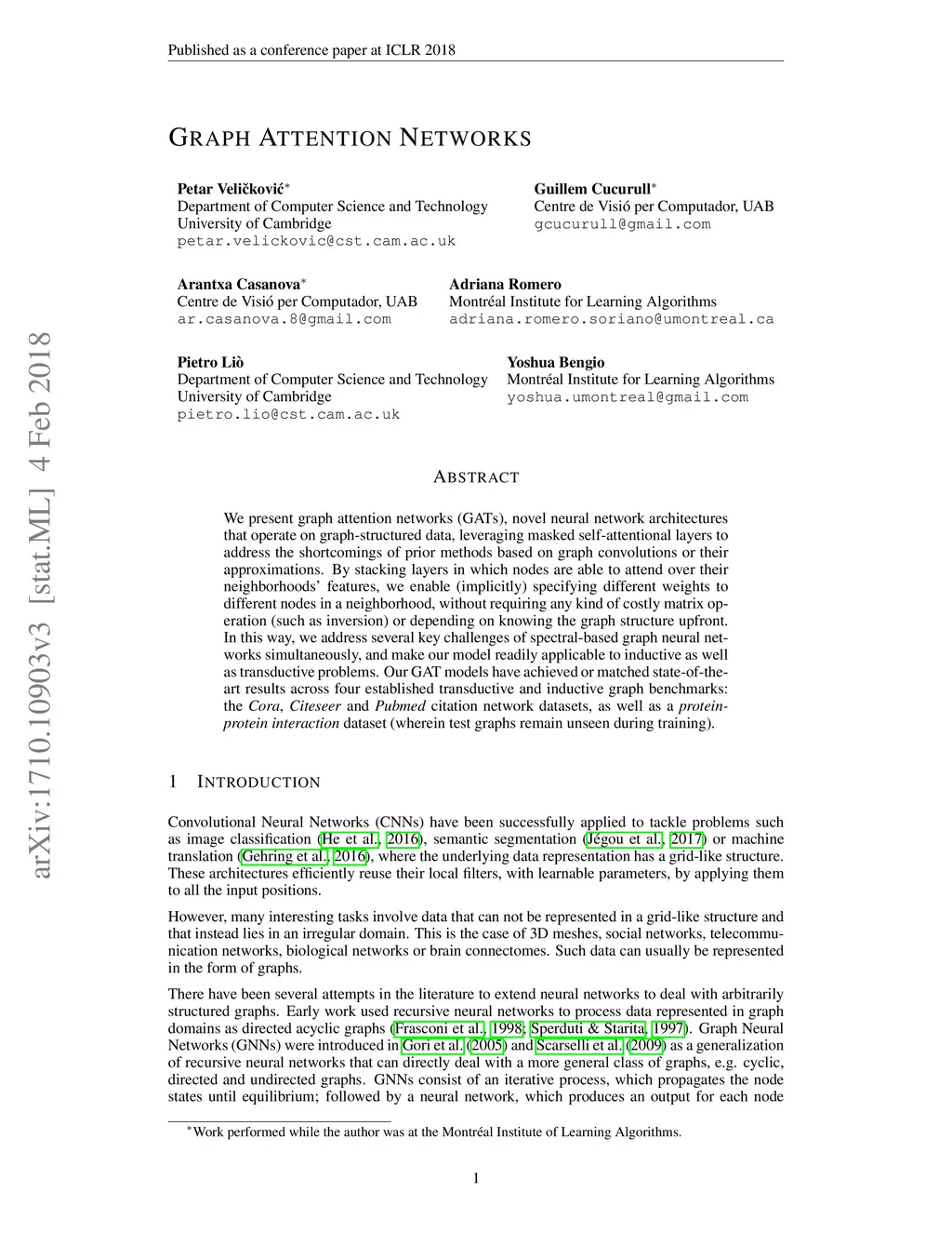 We present graph attention networks (GATs), novel neural network architectures that operate on graph-structured data, leveraging masked self-attentional layers to address the shortcomings of prior methods based on graph convolutions or their approximations. By stacking layers in which nodes are able to attend over their neighborhoods' features, we enable (implicitly) specifying different weights to different nodes in a neighborhood, without requiring any kind of costly matrix operation (such as inversion) or depending on knowing the graph structure upfront. In this way, we address several key challenges of spectral-based graph neural networks simultaneously, and make our model readily applicable to inductive as well as transductive problems. Our GAT models have achieved or matched state-of-the-art results across four established transductive and inductive graph benchmarks: the Cora, Citeseer and Pubmed citation network datasets, as well as a protein-protein interaction dataset (wherein test graphs remain unseen during training).