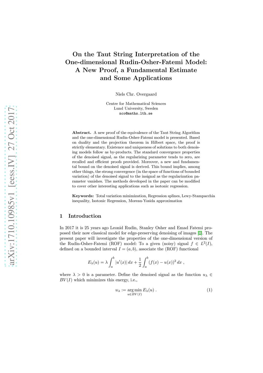 A new proof of the equivalence of the Taut String Algorithm and the one-dimensional Rudin-Osher-Fatemi model is presented. Based on duality and the projection theorem in Hilbert space, the proof is strictly elementary. Existence and uniqueness of solutions to both denoising models follow as by-products. The standard convergence properties of the denoised signal, as the regularizing parameter tends to zero, are recalled and efficient proofs provided. Moreover, a new and fundamental bound on the denoised signal is derived. This bound implies, among other things, the strong convergence (in the space of functions of bounded variation) of the denoised signal to the insignal as the regularization parameter vanishes. The methods developed in the paper can be modified to cover other interesting applications such as isotonic regression.
