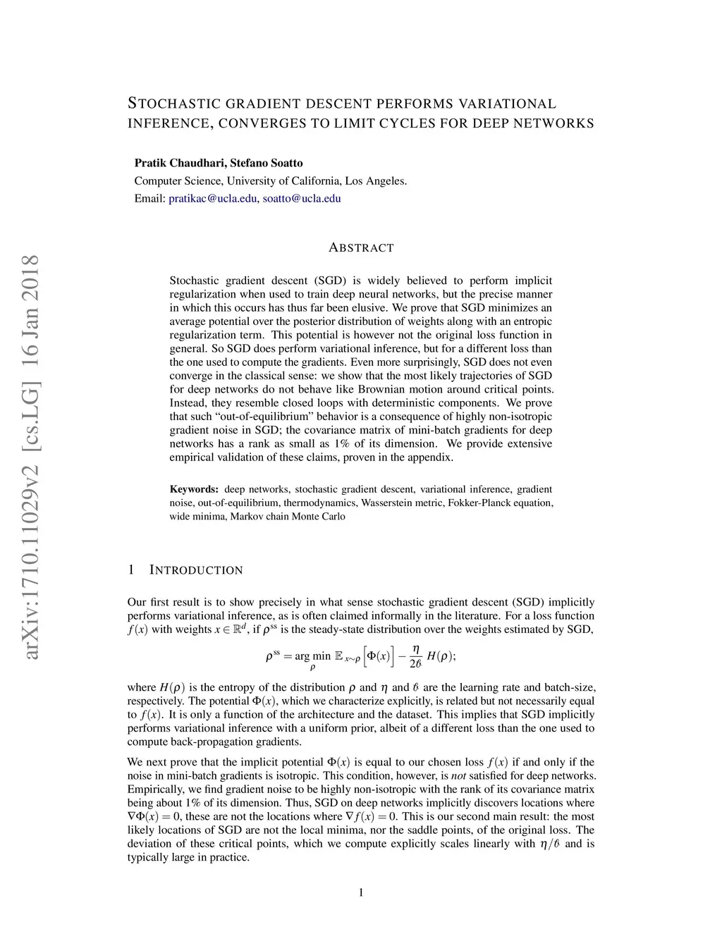 Stochastic gradient descent (SGD) is widely believed to perform implicit regularization when used to train deep neural networks, but the precise manner in which this occurs has thus far been elusive. We prove that SGD minimizes an average potential over the posterior distribution of weights along with an entropic regularization term. This potential is however not the original loss function in general. So SGD does perform variational inference, but for a different loss than the one used to compute the gradients. Even more surprisingly, SGD does not even converge in the classical sense: we show that the most likely trajectories of SGD for deep networks do not behave like Brownian motion around critical points. Instead, they resemble closed loops with deterministic components. We prove that such "out-of-equilibrium" behavior is a consequence of highly non-isotropic gradient noise in SGD; the covariance matrix of mini-batch gradients for deep networks has a rank as small as 1% of its dimension. We provide extensive empirical validation of these claims, proven in the appendix.