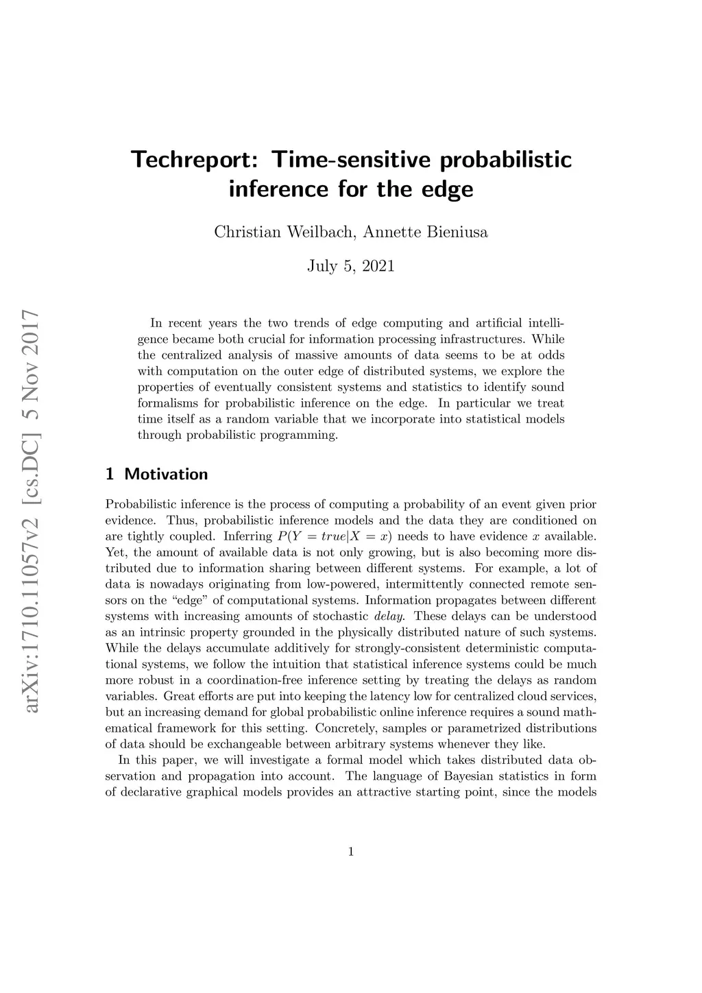In recent years the two trends of edge computing and artificial intelligence became both crucial for information processing infrastructures. While the centralized analysis of massive amounts of data seems to be at odds with computation on the outer edge of distributed systems, we explore the properties of eventually consistent systems and statistics to identify sound formalisms for probabilistic inference on the edge. In particular we treat time itself as a random variable that we incorporate into statistical models through probabilistic programming.