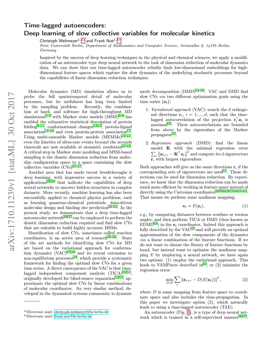 Inspired by the success of deep learning techniques in the physical and chemical sciences, we apply a modification of an autoencoder type deep neural network to the task of dimension reduction of molecular dynamics data. We can show that our time-lagged autoencoder reliably finds low-dimensional embeddings for high-dimensional feature spaces which capture the slow dynamics of the underlying stochastic processes - beyond the capabilities of linear dimension reduction techniques.