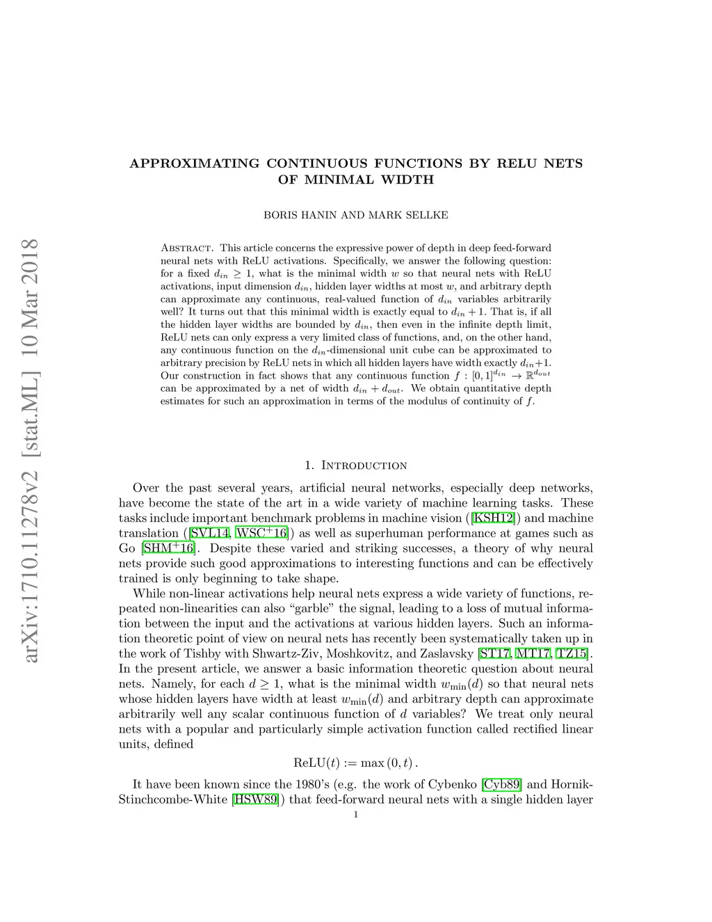 This article concerns the expressive power of depth in deep feed-forward neural nets with ReLU activations. Specifically, we answer the following question: for a fixed what is the minimal width so that neural nets with ReLU activations, input dimension , hidden layer widths at most and arbitrary depth can approximate any continuous, real-valued function of variables arbitrarily well? It turns out that this minimal width is exactly equal to That is, if all the hidden layer widths are bounded by , then even in the infinite depth limit, ReLU nets can only express a very limited class of functions, and, on the other hand, any continuous function on the -dimensional unit cube can be approximated to arbitrary precision by ReLU nets in which all hidden layers have width exactly Our construction in fact shows that any continuous function can be approximated by a net of width . We obtain quantitative depth estimates for such an approximation in terms of the modulus of continuity of .