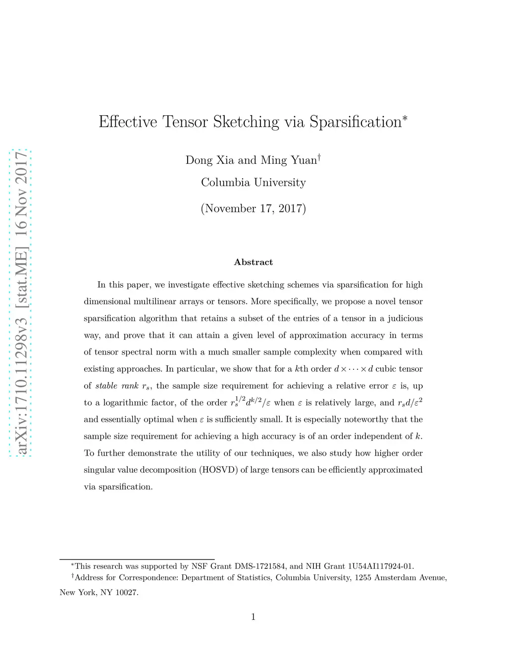 In this paper, we investigate effective sketching schemes via sparsification for high dimensional multilinear arrays or tensors. More specifically, we propose a novel tensor sparsification algorithm that retains a subset of the entries of a tensor in a judicious way, and prove that it can attain a given level of approximation accuracy in terms of tensor spectral norm with a much smaller sample complexity when compared with existing approaches. In particular, we show that for a th order cubic tensor of {\it stable rank} , the sample size requirement for achieving a relative error is, up to a logarithmic factor, of the order when is relatively large, and and essentially optimal when is sufficiently small. It is especially noteworthy that the sample size requirement for achieving a high accuracy is of an order independent of . To further demonstrate the utility of our techniques, we also study how higher order singular value decomposition (HOSVD) of large tensors can be efficiently approximated via sparsification.